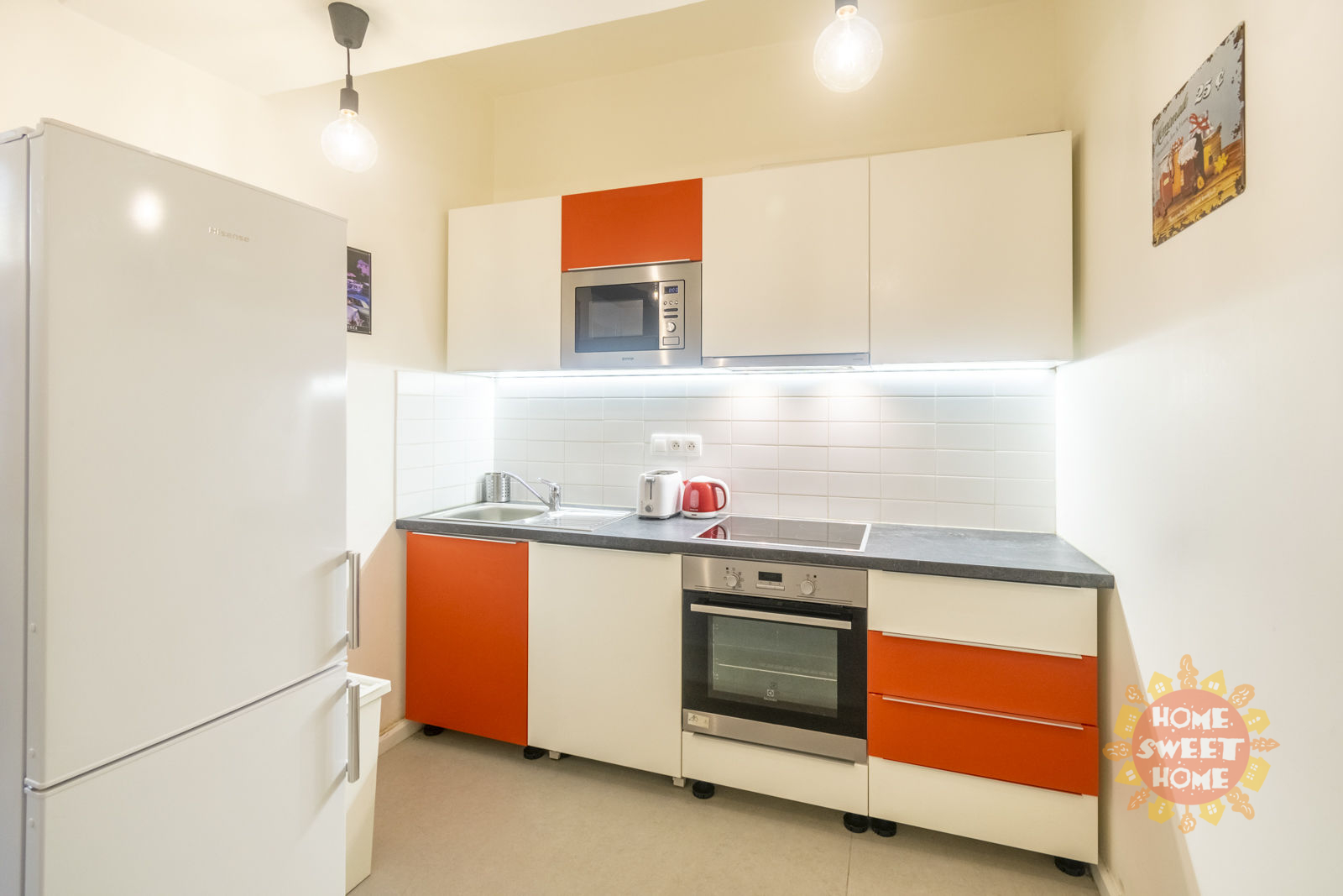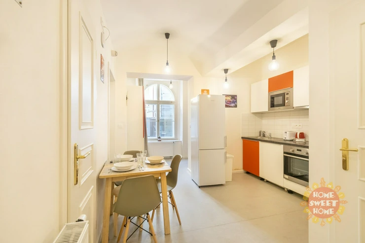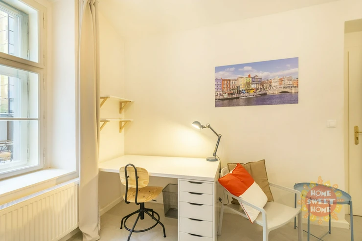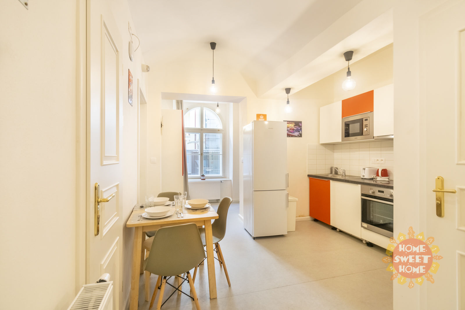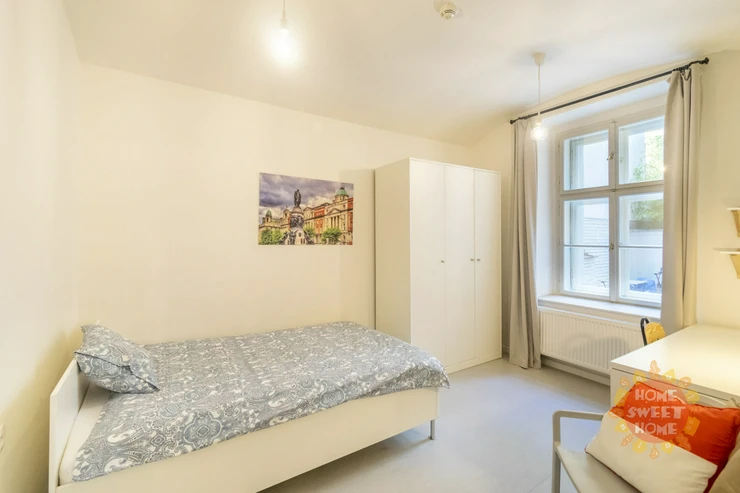 Beautiful furnished 13m² room with a shared kitchen with dinning corner, bathroom with shower and toilet is located in Kinsky Residence on the lower ground floor of a brick house, street nám.Kinských, Prague 5. The house was completely renovated in 2019.