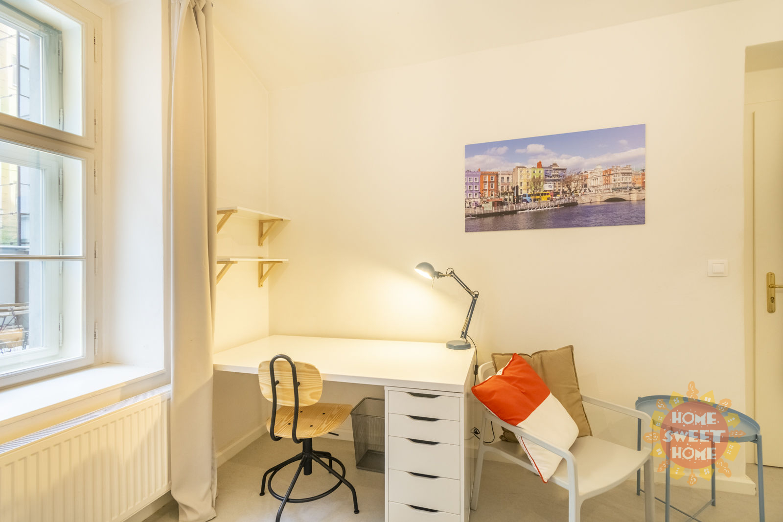 The apartment, also the room is fully furnished. There is an iron, ironing board and tools for cleaning. The room is in a 3 bedroom apartment with 2 bathrooms and extra toilet. Common area cleaning is already included in the rent once a week. There is also a free fitness room, a coin-operated laundry, a common backyard.