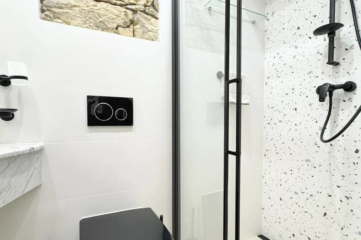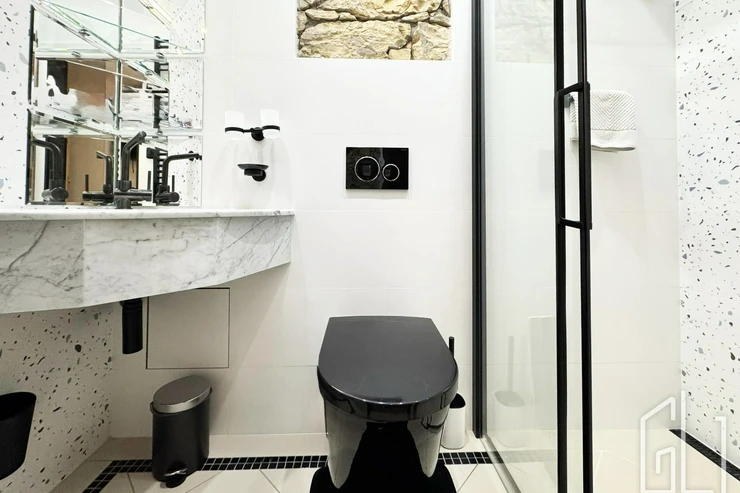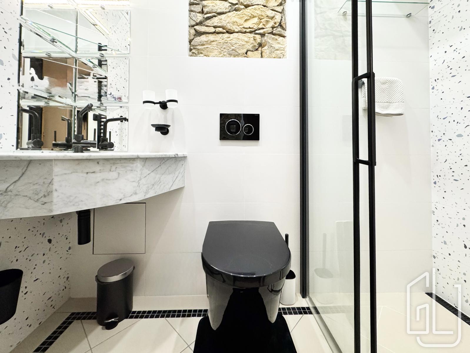 Koupelna: Sprchový kout, toaleta, umyvadlo a pračka.