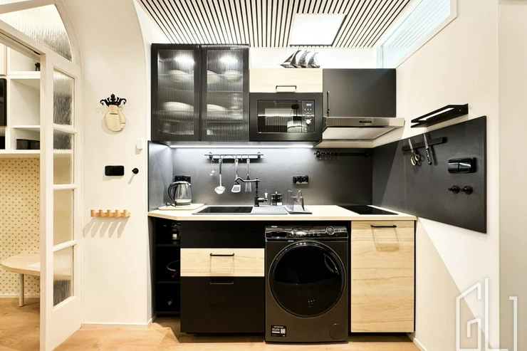 Vybavení kuchyně: Varná deska, lednice, mikrovlnka, myčka a kompletní sadu nádobí.