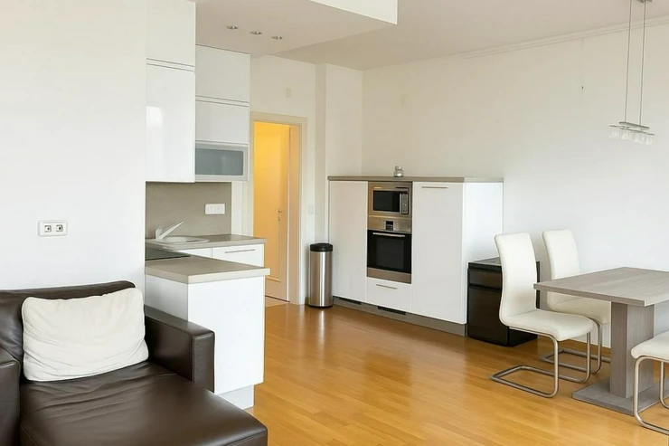 Dispozice zahrnuje prostorný obývací pokoj s krásnou novou kuchyňskou linkou a vestavěnými spotřebiči, světlou ložnici, moderní koupelnu s vanou a WC, komoru a prostornou předsíň. Byt je celkově plný světla, což zajišťuje příjemnou atmosféru po celý den.