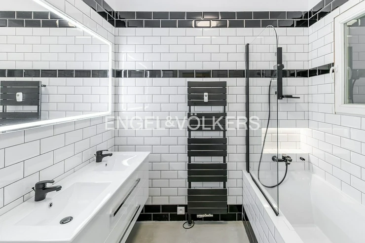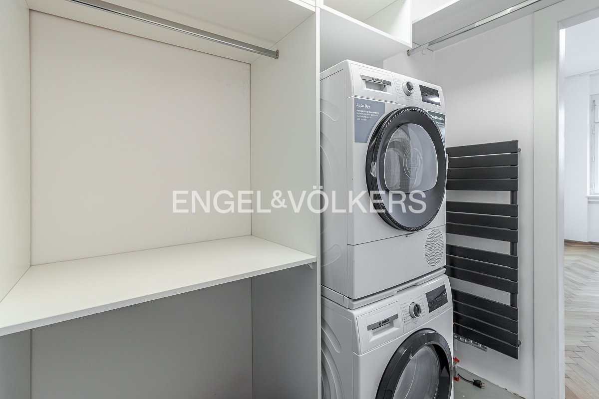 The apartment consists of two bedrooms and a living room with a kitchenette. The kitchenette is brand new and fully equipped with Electrolux appliances. The living room is furnished with sofas, and there are two spacious bedrooms. One bedroom has a spacious wardrobe and a utility room equipped with a new washing machine and dryer. The stylish bathroom has a bathtub with a shower screen.