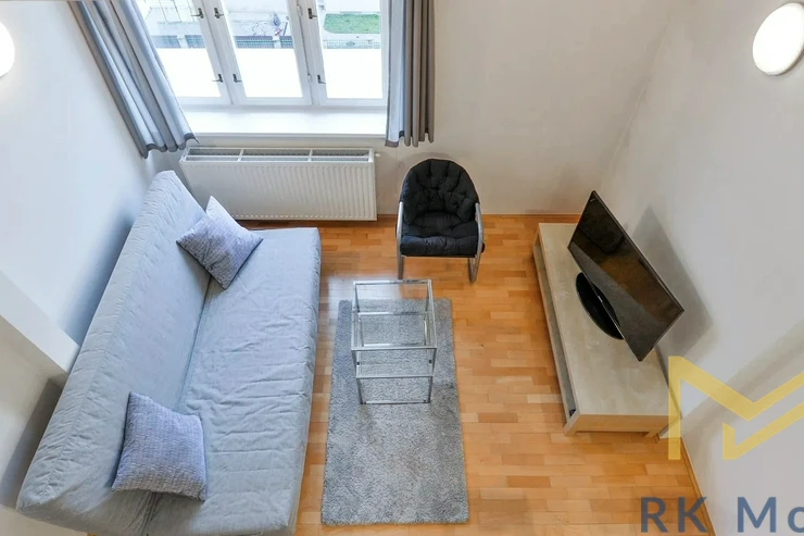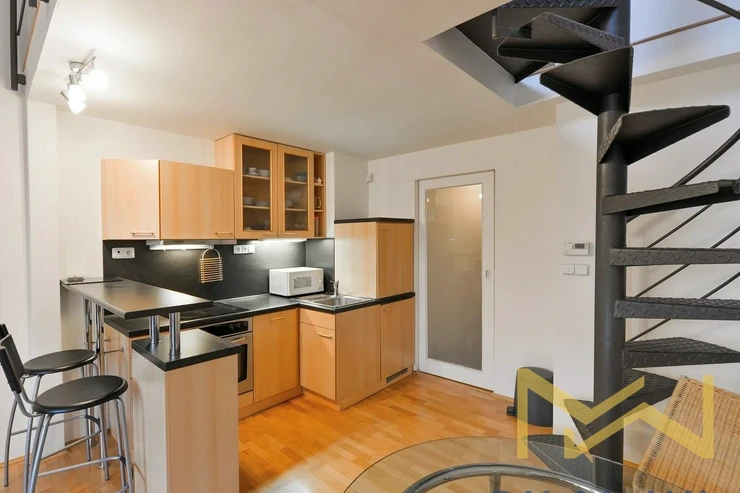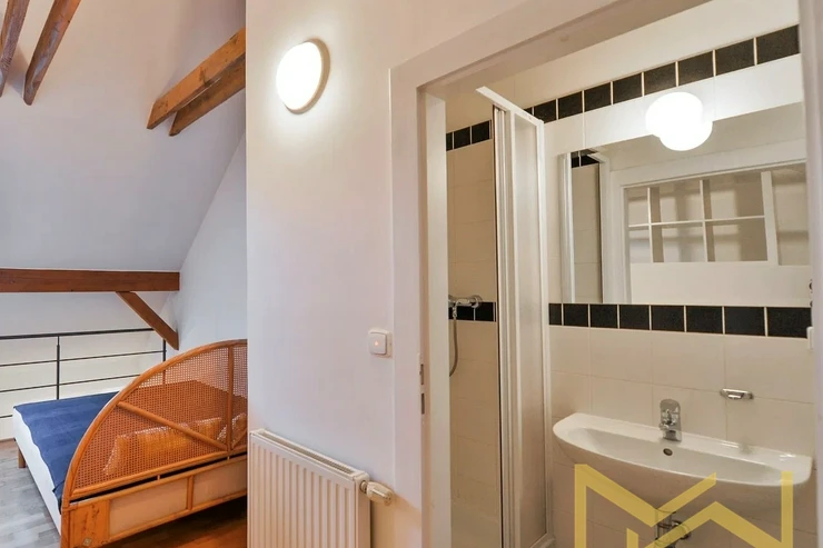 We offer for rent a furnished attic one-bedroom duplex apartment with a floor area of 45 sqm, located on the 4th floor (5th above-ground level) of a fully renovated and well-maintained residential building with an elevator, in Zelená Street, Prague 6 – Dejvice.