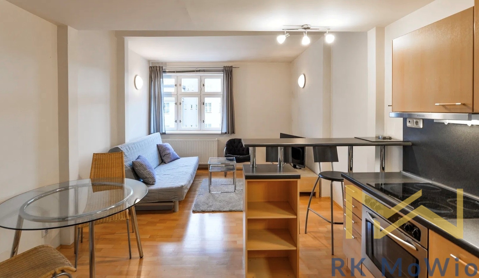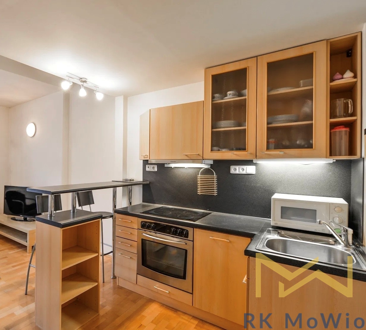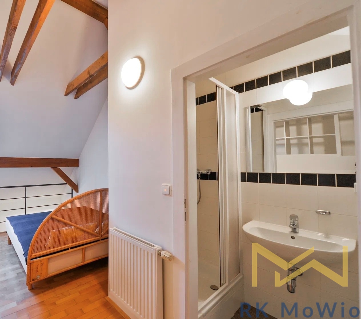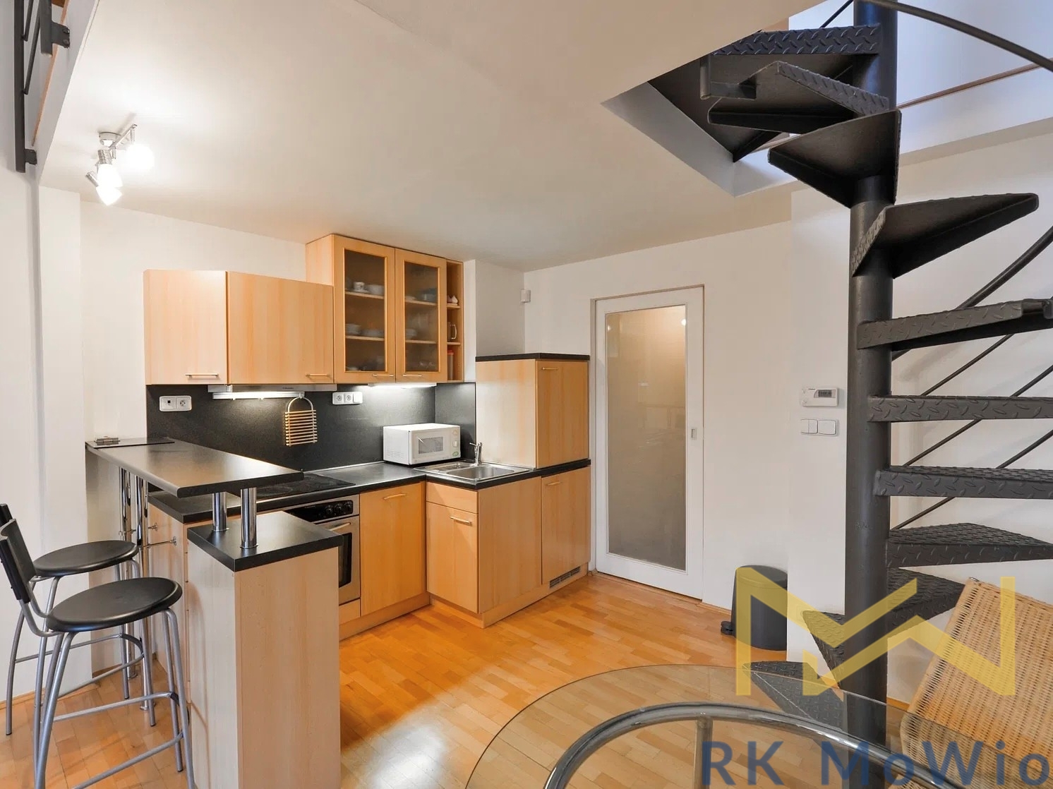 The layout of the apartment includes an entrance hall, a living room with a kitchenette and dining area, and a separate toilet. The upper floor is accessible via a spiral staircase and features an open gallery with a bedroom and a bathroom with a shower. Apartment equipment includes: a kitchen unit (with a fridge-freezer, ceramic cooktop, extractor hood, dishwasher, and electric oven), built-in wardrobes, a washing machine and dryer, high-speed internet connection preparation, wooden floors and tiles.