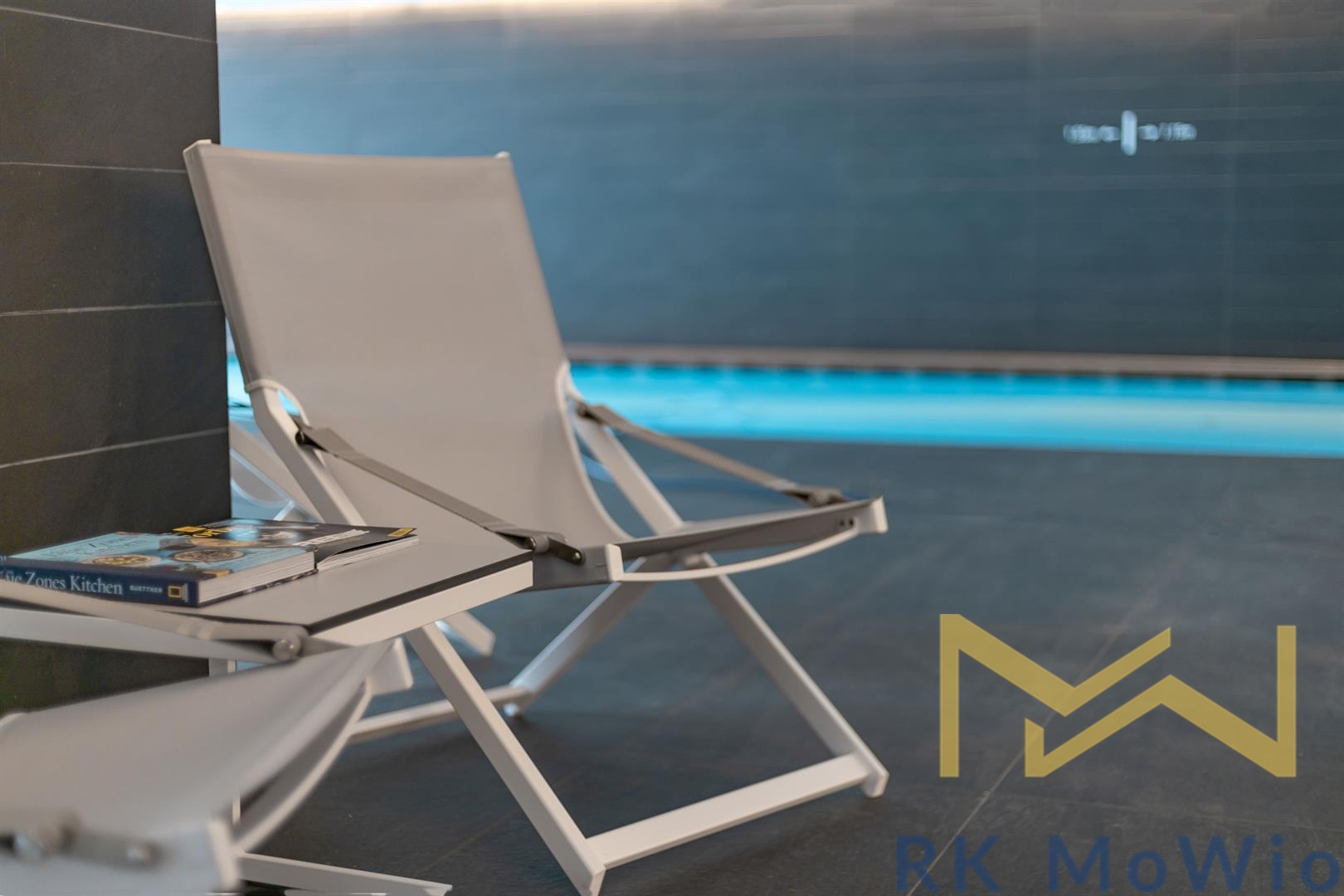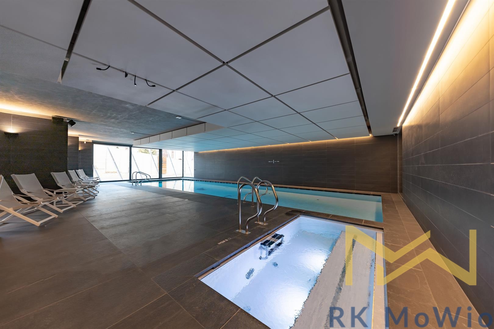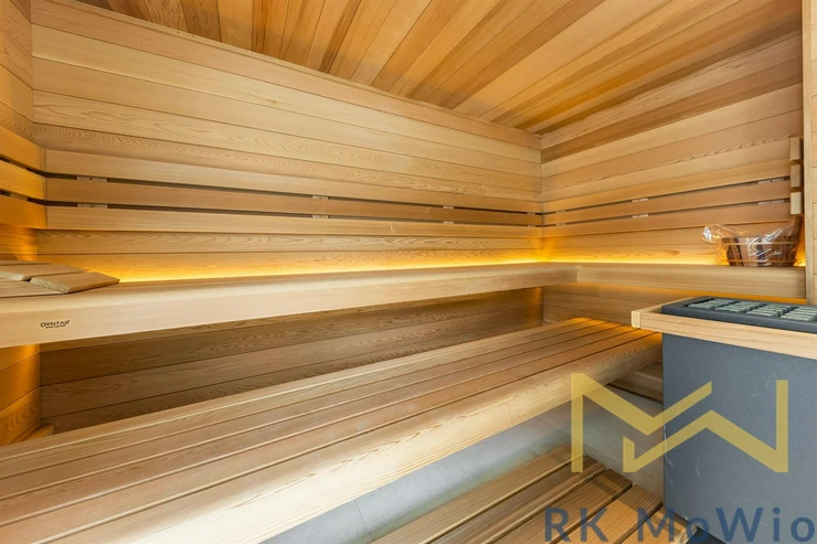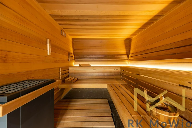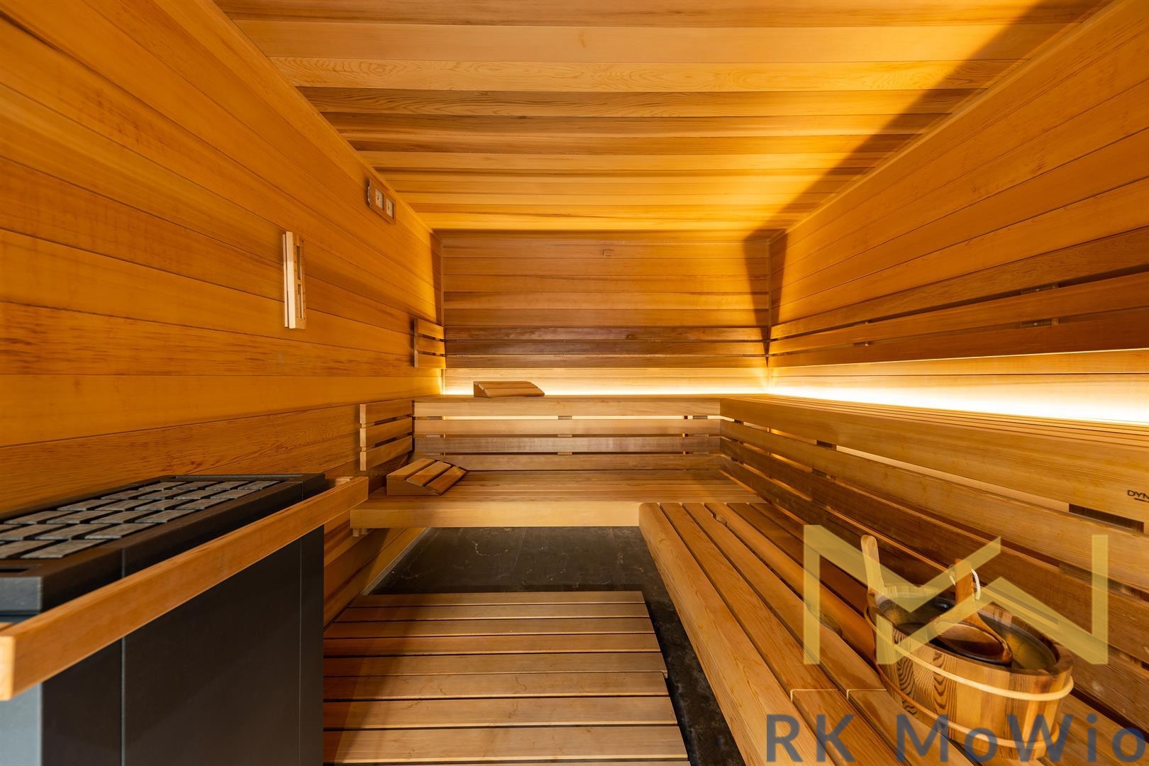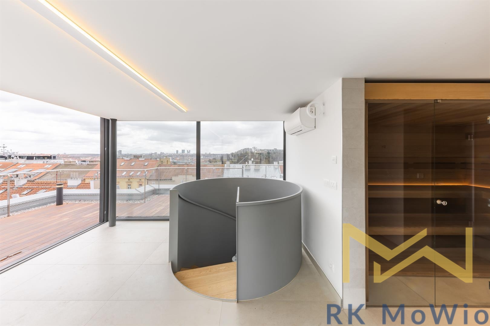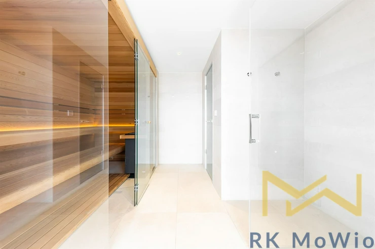 The lower floor features a spacious living room with a fireplace, kitchen and dining area with access to a terrace, master bedroom with bathroom, walk-in closet, and access to a second terrace, two additional bedrooms with terrace access, a bathroom, separate toilet, and storage room. A stylish spiral staircase leads to the upper floor, where you will find a gallery with access to a terrace and rooftop garden with panoramic views, a bathroom, and a wellness area with sauna. Additional apartment features include a fully equipped kitchen (fridge with freezer, hob, electric oven, dishwasher, extractor hood, and microwave), the option to install a washer and dryer, high-speed internet connection, wooden floors, and tiling. Public areas are equipped with CCTV cameras, and entry and access are controlled by chip cards. Apartments are fitted with security doors, safety glass, and alarms.