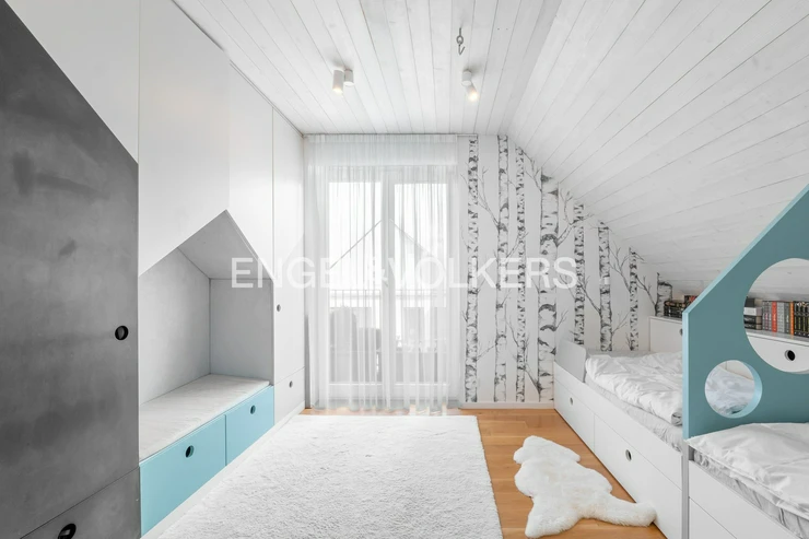 The lower part of the apartment features a living room with a fully equipped kitchen with Siemens appliances and direct access to two terraces, a master bedroom with a dressing room, built-in storage spaces, access to two terraces, and a magnificent view of the city, Petřín, and the National Theatre, as well as a second bedroom with built-in storage spaces, a bathroom with a bathtub and a shower corner and access to a terrace, a second bathroom with a toilet, washing machine, and dryer, and also an entrance hall. The upper floor features a gallery and two further bedrooms / guest rooms and a third bathroom with a shower corner and a toilet.
