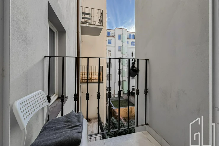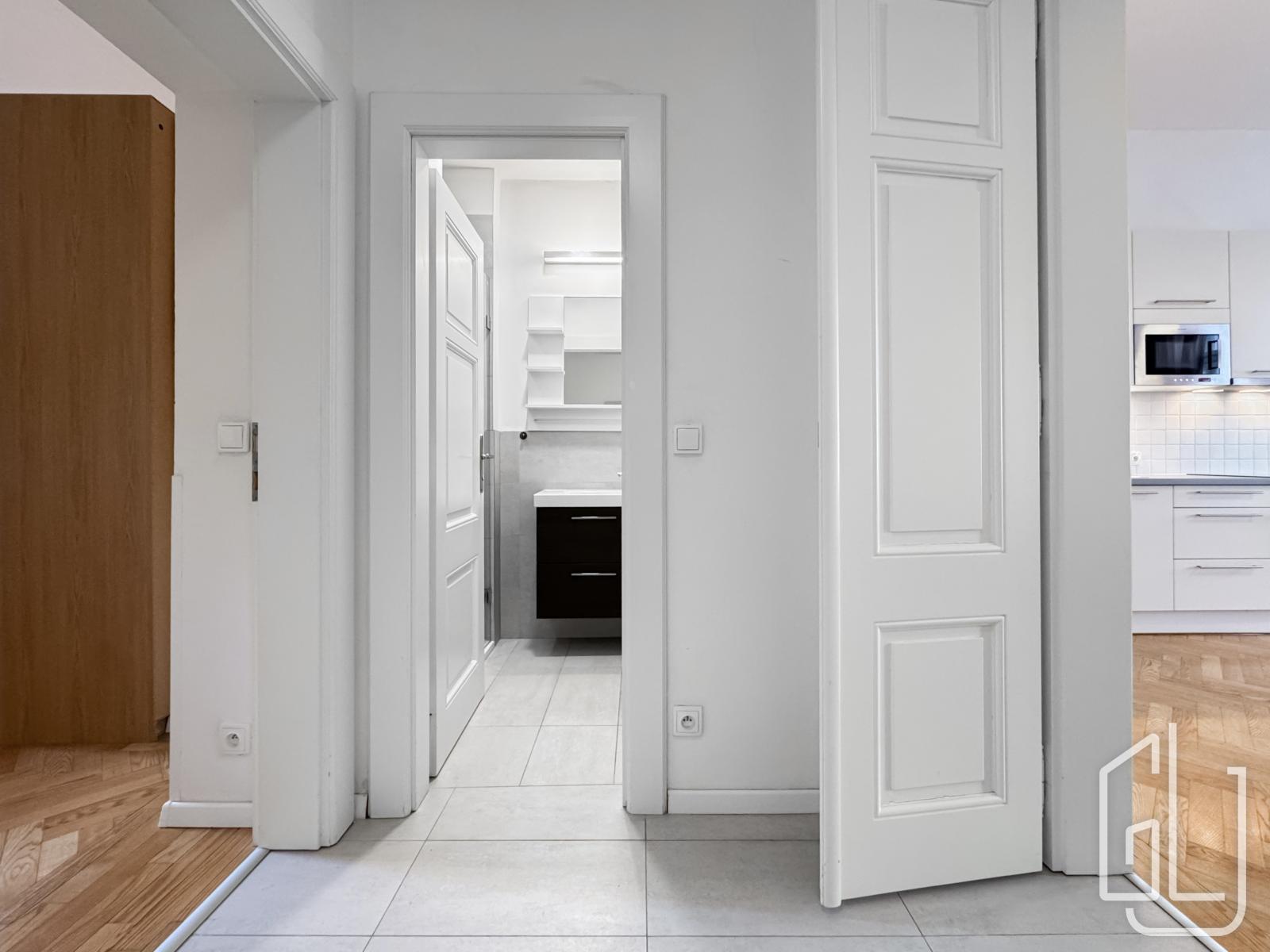 From the hallway there is access to the balcony facing the courtyard, which provides a cosy spot for morning coffee or an evening drink. A private 2 m storage unit in the basement of the building is included in the rent and is ideal for seasonal items, sports equipment or luggage. The hallway of the apartment offers a practical built-in wardrobe and enough space for a shoe rack and coat hangers.