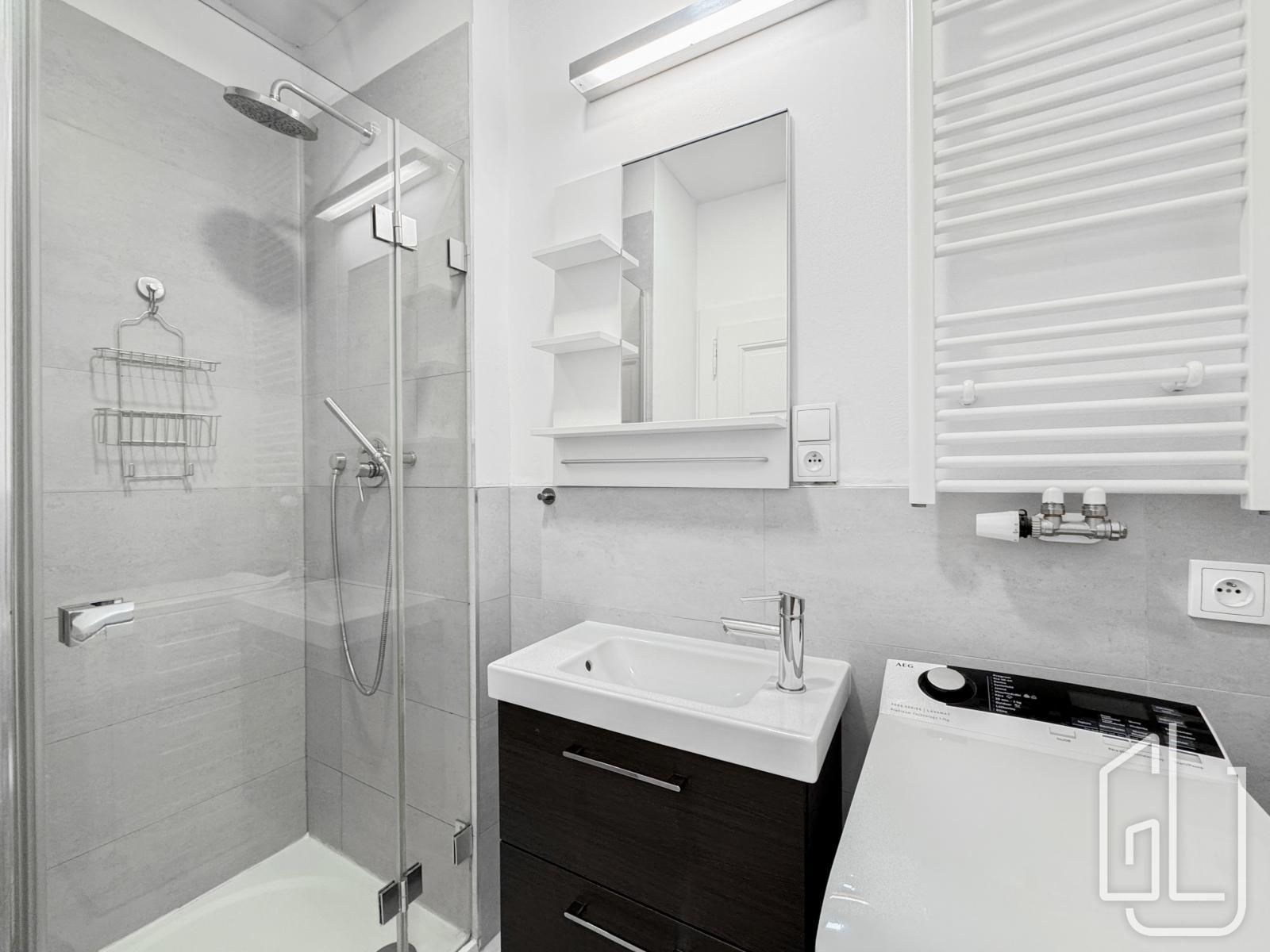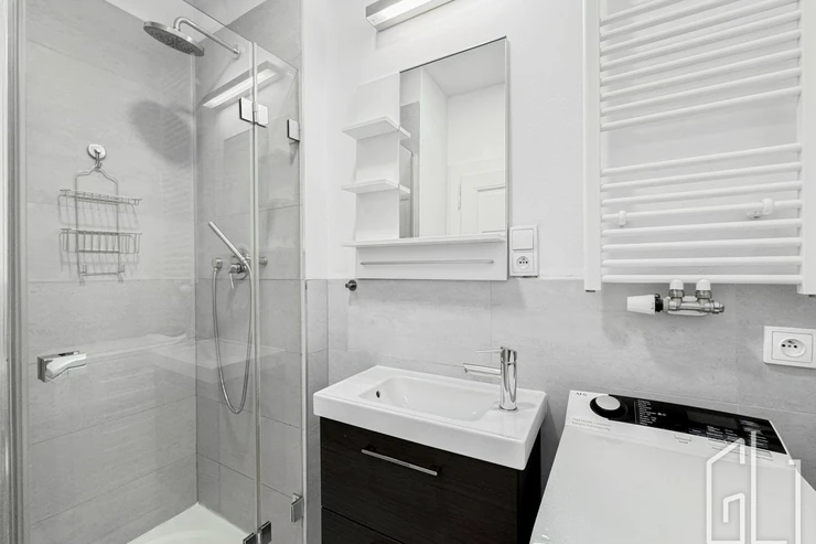 The bathroom is fitted with a shower, washbasin with cabinet, mirror with lighting, towel radiator and washing machine. The overall look is modern and practical, in neutral tones that are easy to combine with any style of accessories.