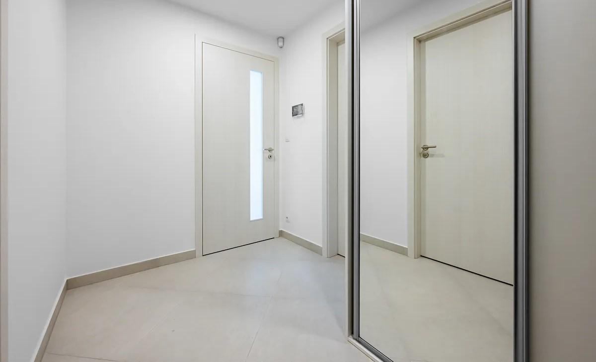 The layout of the apartment includes a large living room with a modern Hanák kitchen equipped with high-quality built-in appliances. The bathroom with a bathtub is complemented by a washing machine and toilet. There is a built-in wardrobe with plenty of storage space in the hallway.