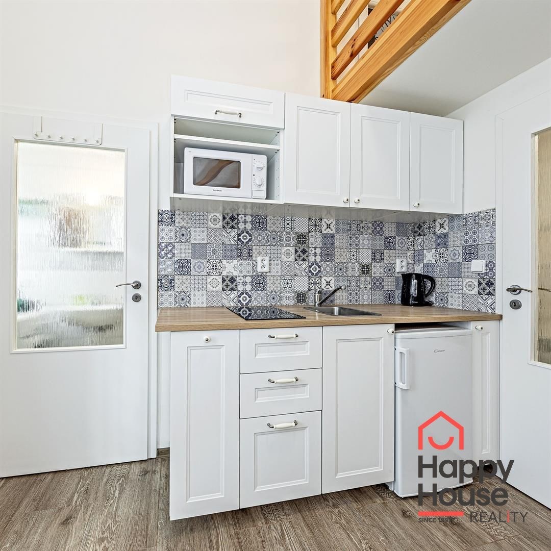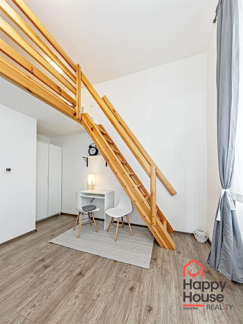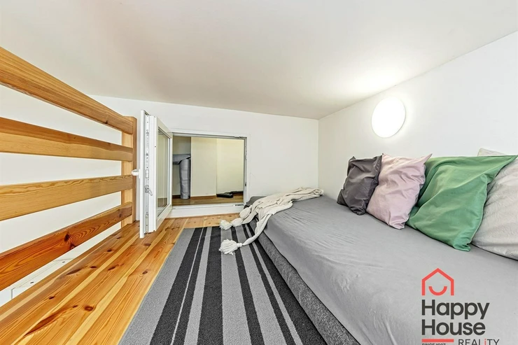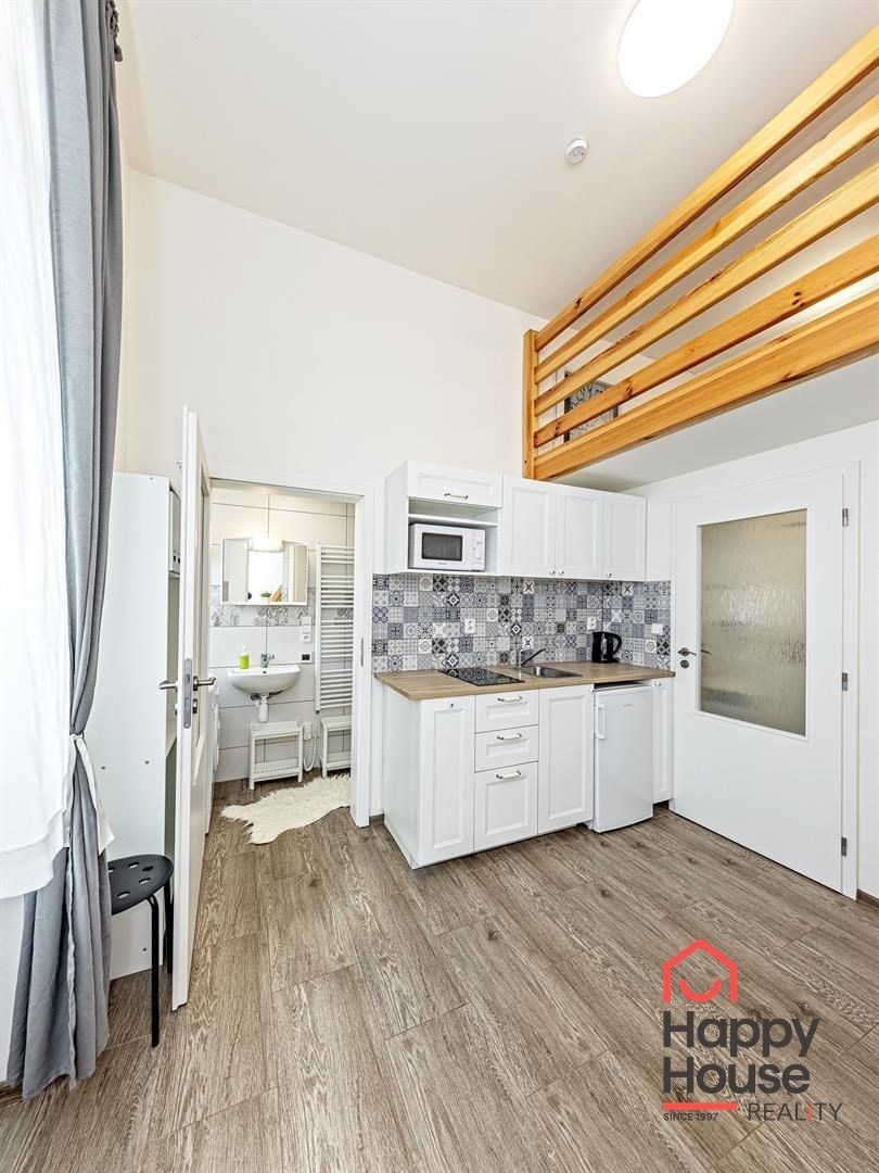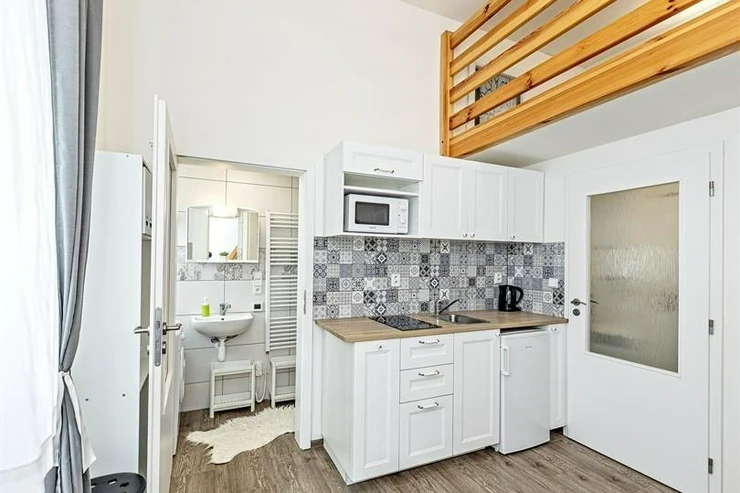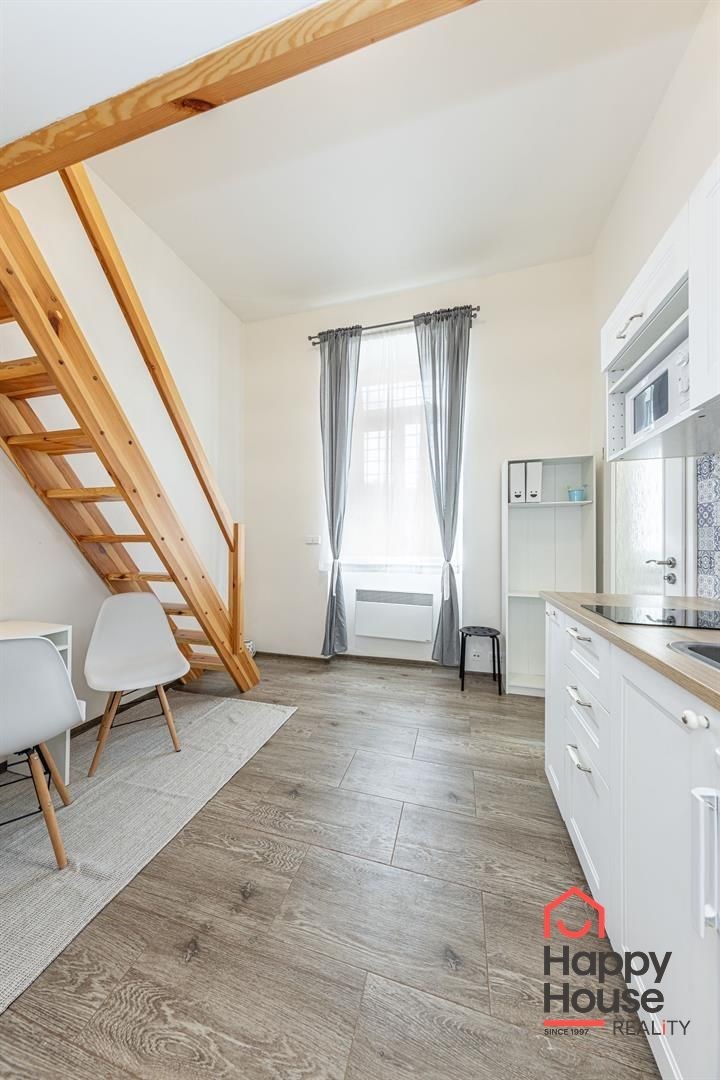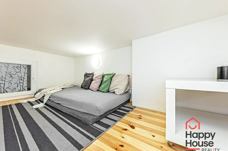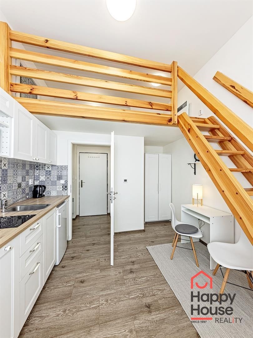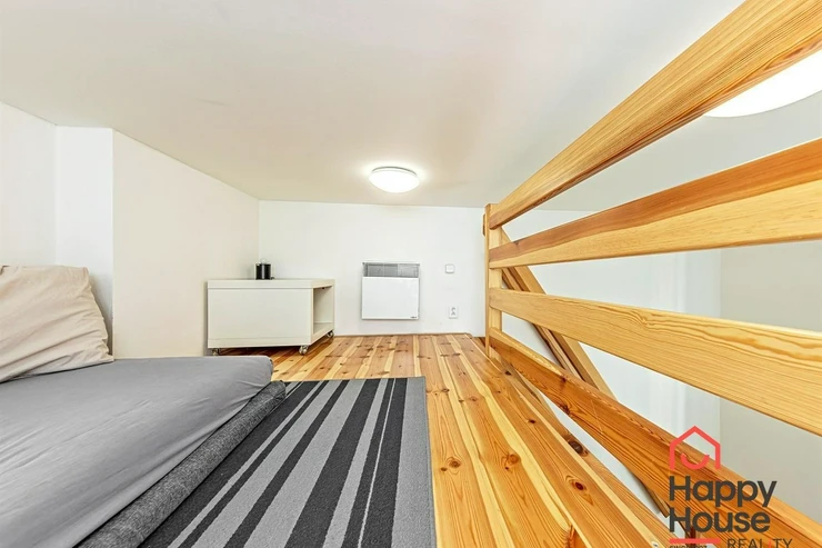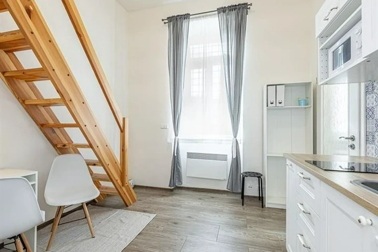 We exclusively offer for rent a spacious, fully furnished studio apartment, located on the elevated ground floor of a renovated brick building in the popular area of Prague 8 in Libeň. The kitchenette includes a kitchen unit, induction double hob, microwave, and refrigerator. The bathroom is equipped with a shower, a heated towel rail, and a washing machine, with a separate toilet. The bed is cleverly situated on a mezzanine, where there is also storage space and a boiler. Vodafone and O2 services are available in the building. There is underfloor heating under the tiled floors. Direct heating available. A cellar is also included. The apartment overlooks a quiet courtyard with mature greenery to the southwest. Street parking - zones.