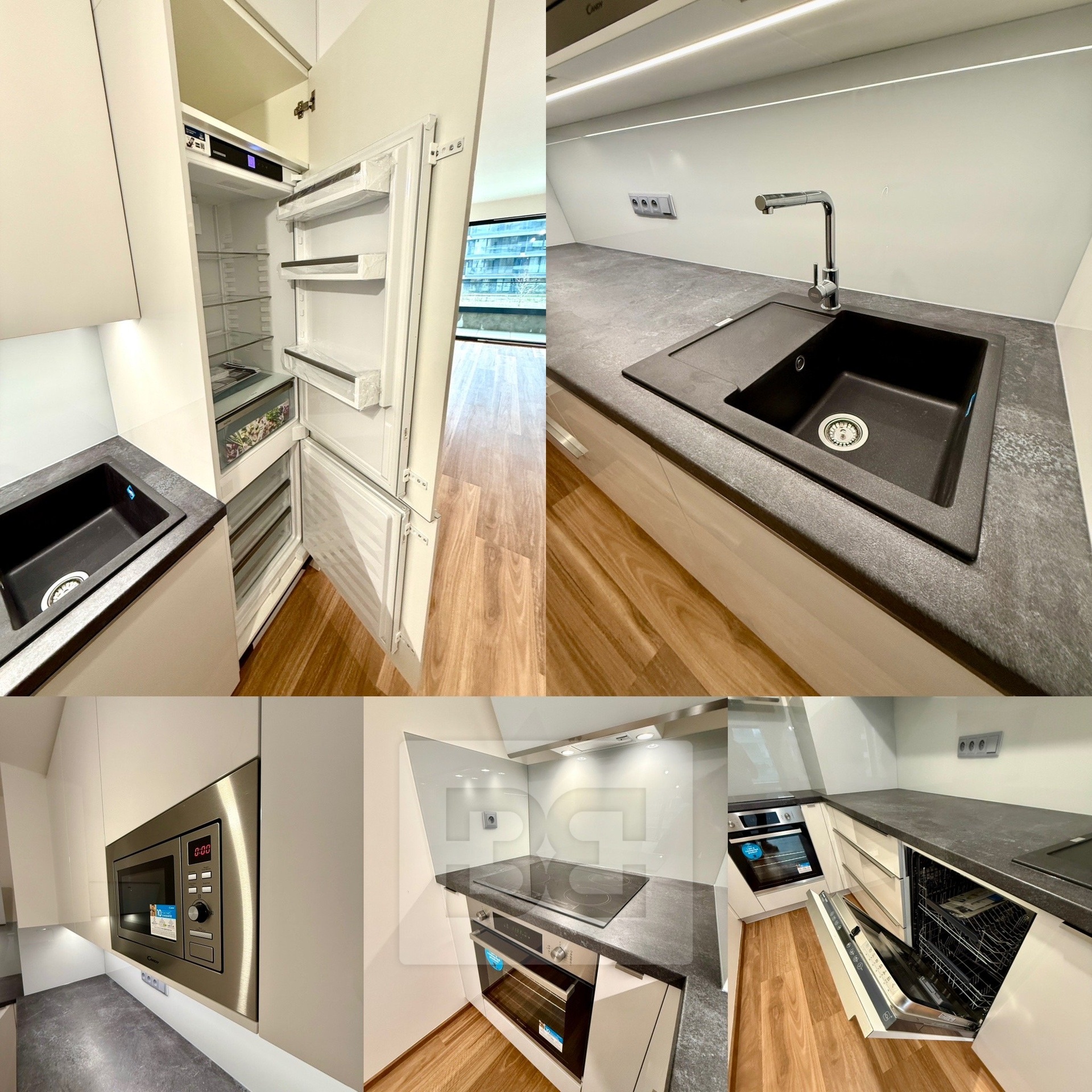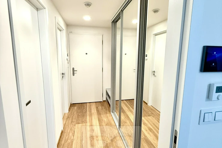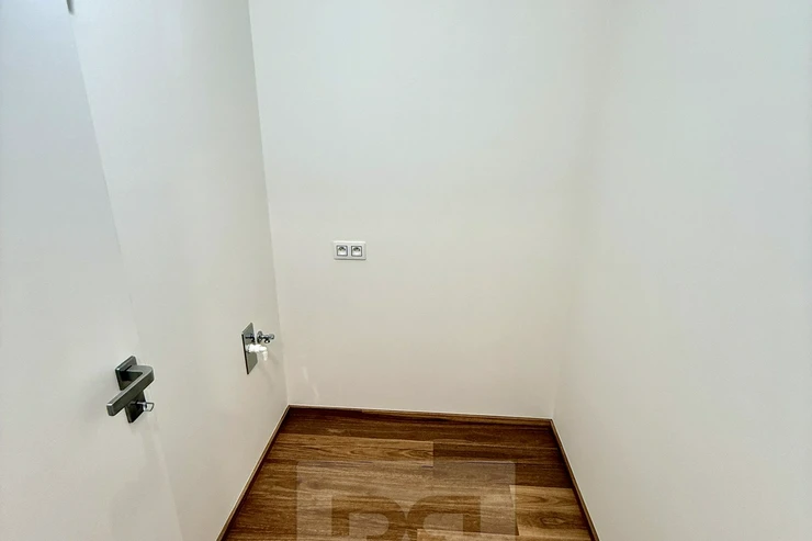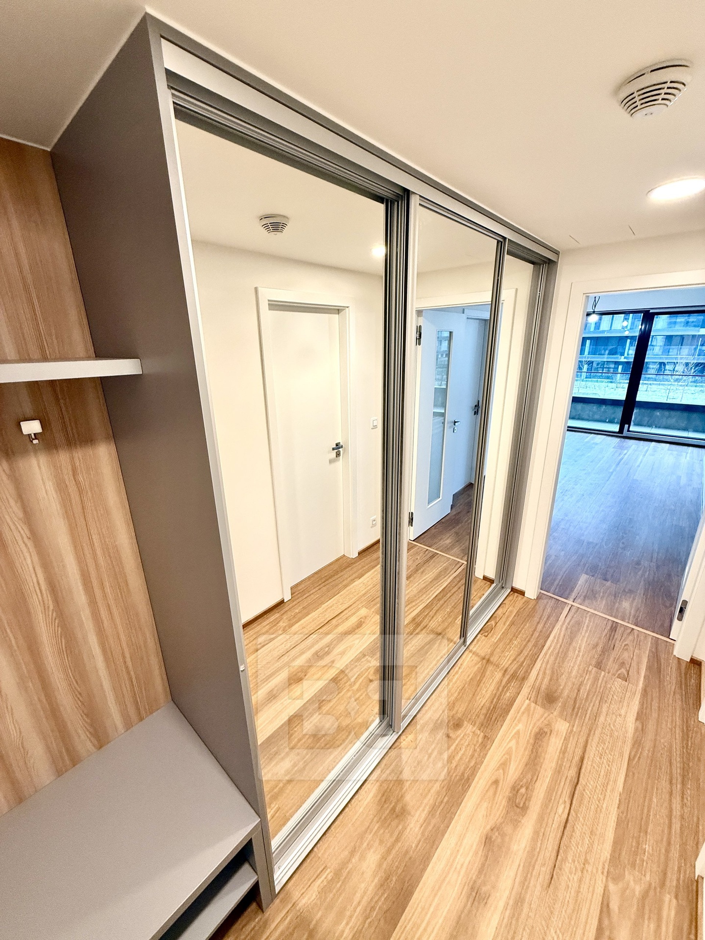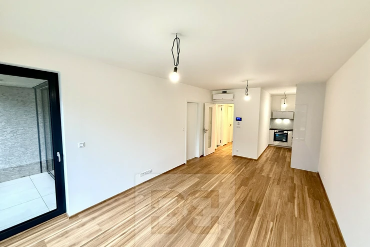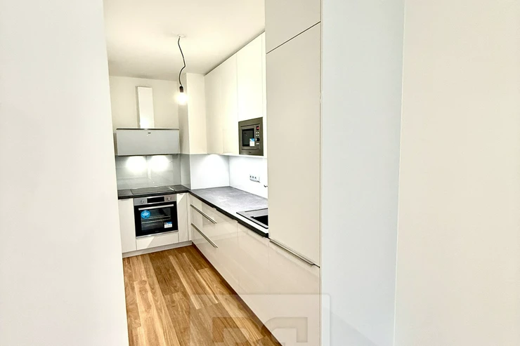 The apartment, which is oriented to a quiet courtyard, has a newly installed kitchen with built-in appliances (induction hob, dishwasher, fridge with freezer, dishwasher, oven and microwave), a built-in wardrobe in the hallway, comfort is increased by recuperation and air conditioning (in both rooms), security will be delivered by the alarm or outdoor security blinds. The apartment will be equipped with lights, a wardrobe and, if interested, a bed (see photo) or, at the owner's request, a washing machine. To the unit belongs a parking space and a cellar.