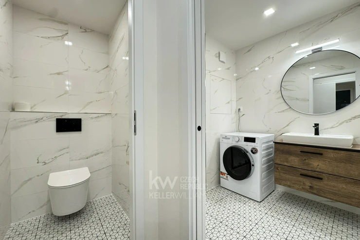 nová koupelna, sanitární zařízení a moderní povrchy s novou pračkou Beko
