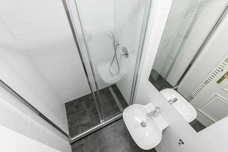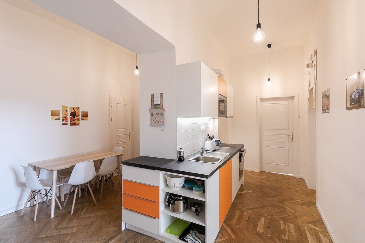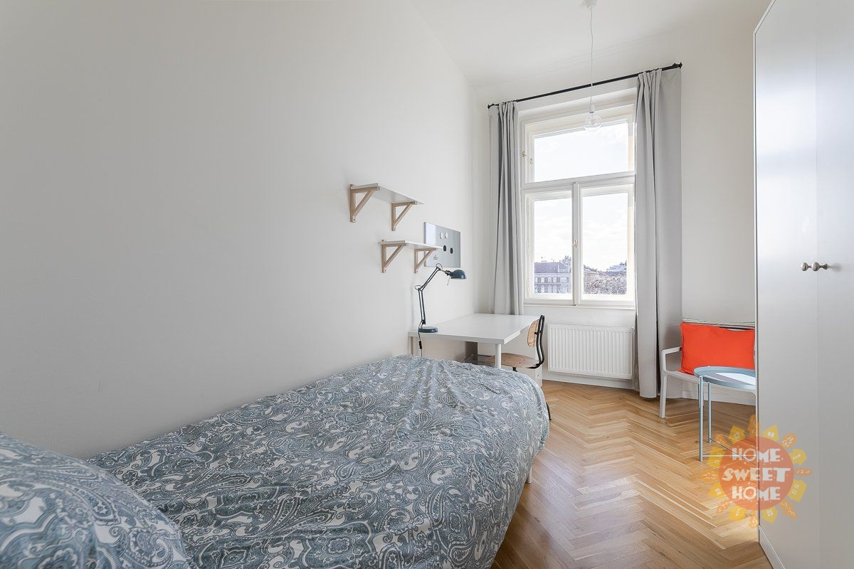 A beautiful, furnished room of 11 m² with a common, equipped kitchen with a dining area, a bathroom with a shower and a toilet is located in Residenc Kinských on the third floor of a brick building in nám. Kínských Street, Prague 5. The house was completely renovated in 2019. Both the room and the apartment are fully furnished, including an iron, ironing board and cleaning equipment. It is located in a 5-room apartment with 2 bathrooms and 2 toilets. Cleaning of the common areas is already included in the rent, once a week. Common areas are fully equipped: washing machine, dishwasher, oven, microwave, kettle, toaster, iron, vacuum cleaner, mop, hob, dishes. The room is equipped with: a bed, a desk, an armchair, a wardrobe, a blanket and a pillow (without bed linen). Internet and cleaning of common areas is already included in the rent, once a week. In addition, there is also a completely free fitness, laundry (coin operated) and a shared terrace. In addition, there is also a completely free fitness, laundry (coin operated) and a shared terrace.