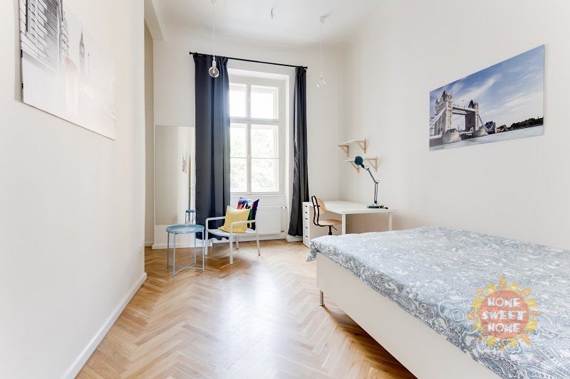 We offer a beautiful, fully furnished room measuring 15 m², located on the raised ground floor of a brick building in the Kinských residence on Kinských Square, Prague 5. The building underwent complete renovation in 2019. The room is part of a five-room apartment with a fully equipped kitchen, dining area, two bathrooms, and a separate toilet. The common areas are fully equipped, including an iron, cleaning supplies, and other necessities for everyday use. The lockable room itself is equipped with a 130x200cm double bed, a desk, an armchair, a wardrobe, a blanket, and a pillow. Internet and cleaning of common areas (once a week) are included in the rent. Tenants also have access to a fitness center, a coin-operated laundry room, and a shared terrace.