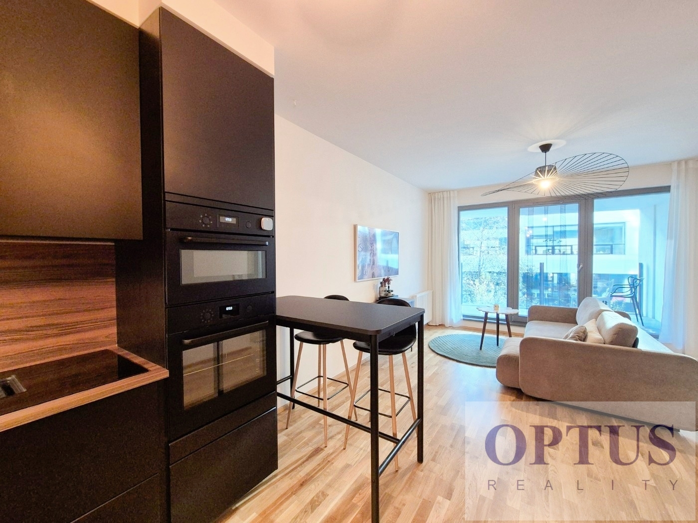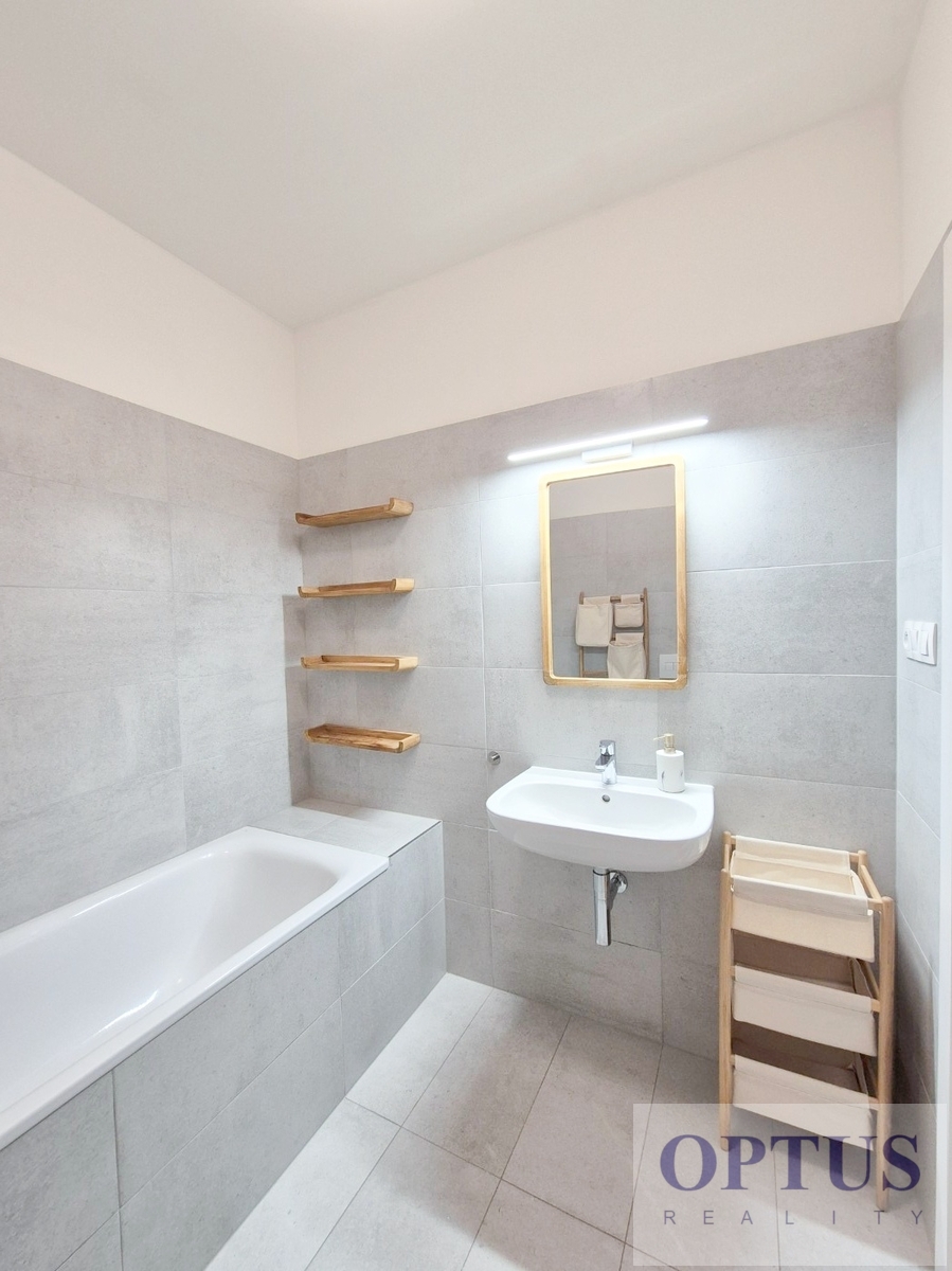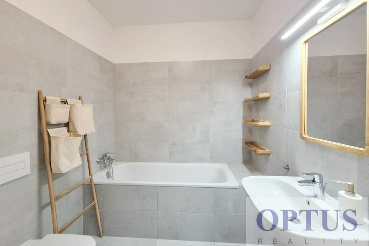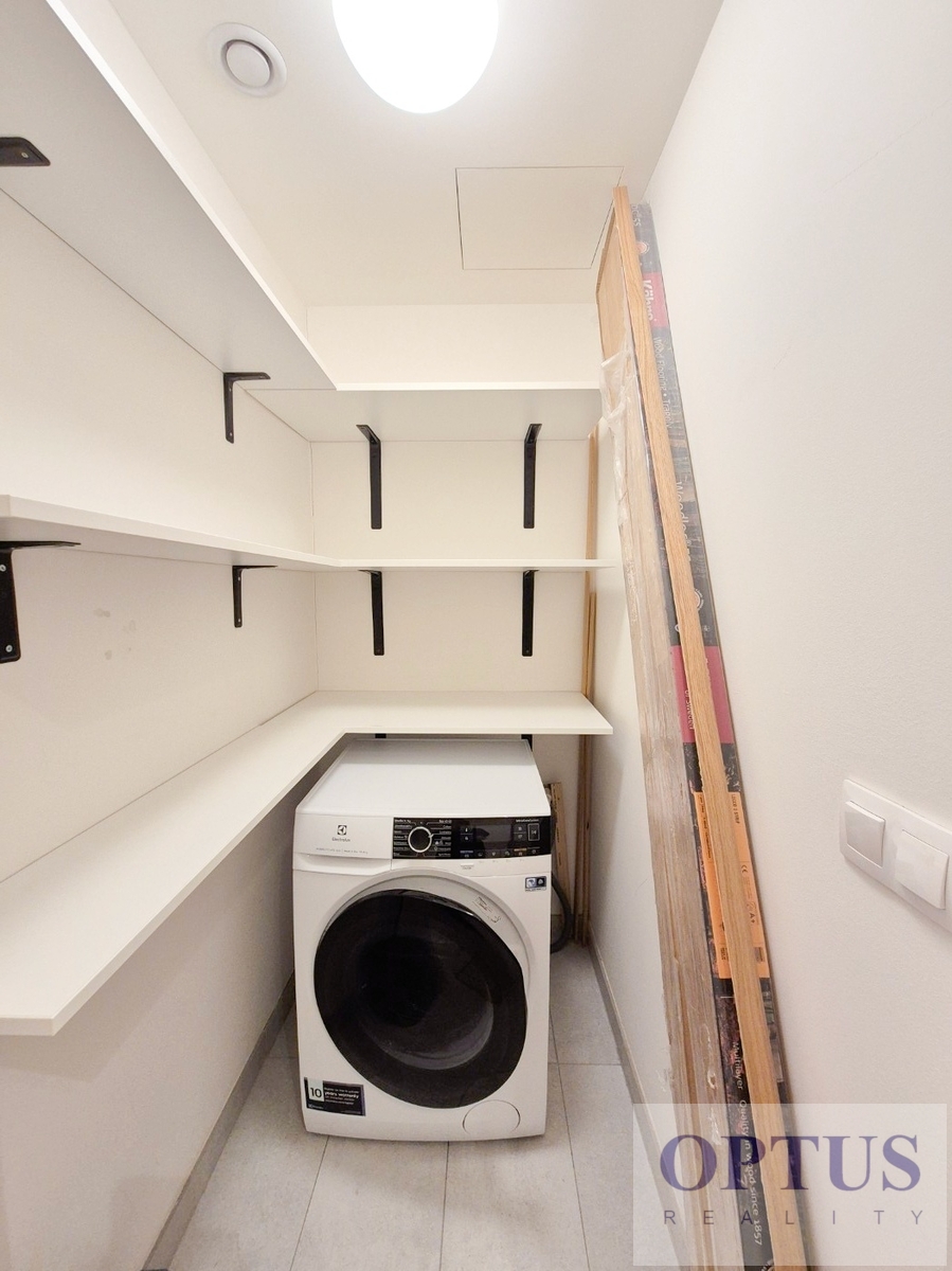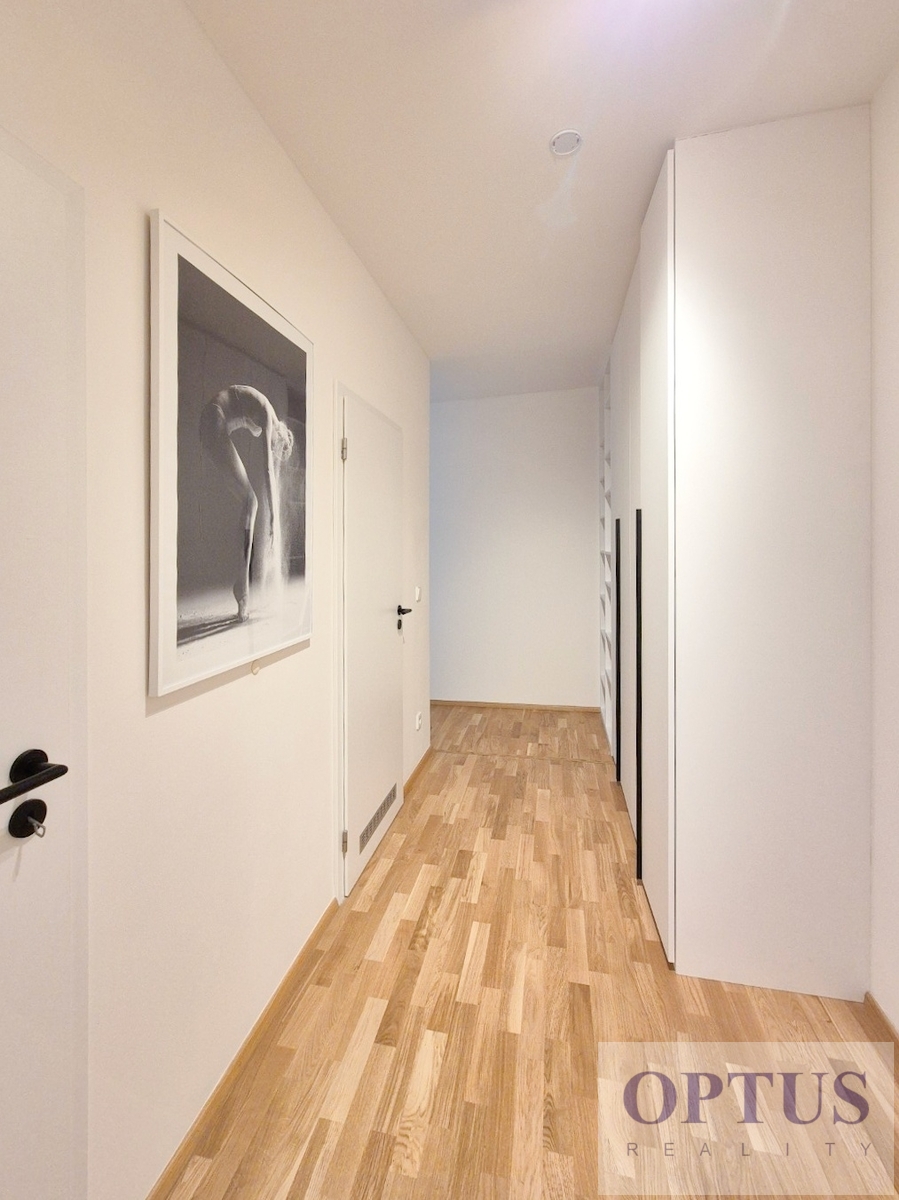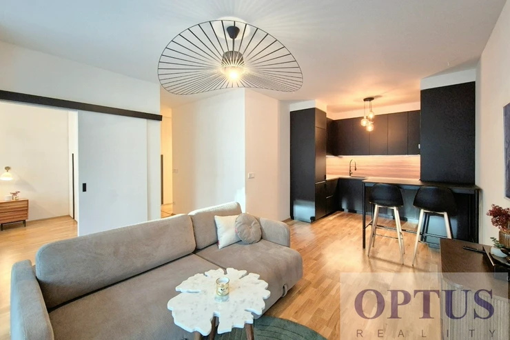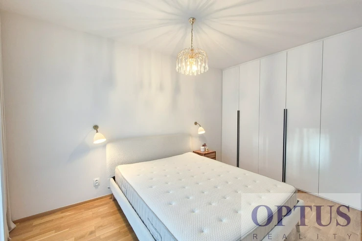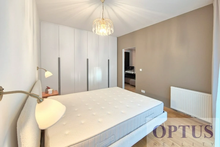 Apartment equipment: The apartment is equipped with luxurious designer furniture and lighting according to the photos, including a Samsung The Frame TV, with built-in wardrobes and a high-quality kitchen with built-in appliances (fridge with freezer, hob with built-in extractor hood, electric oven, microwave with baking function and dishwasher). The apartment also has a washing machine with dryer, preparation for high-speed internet with an optical cable up to 1 Gb/s, wooden floors and central heating.
