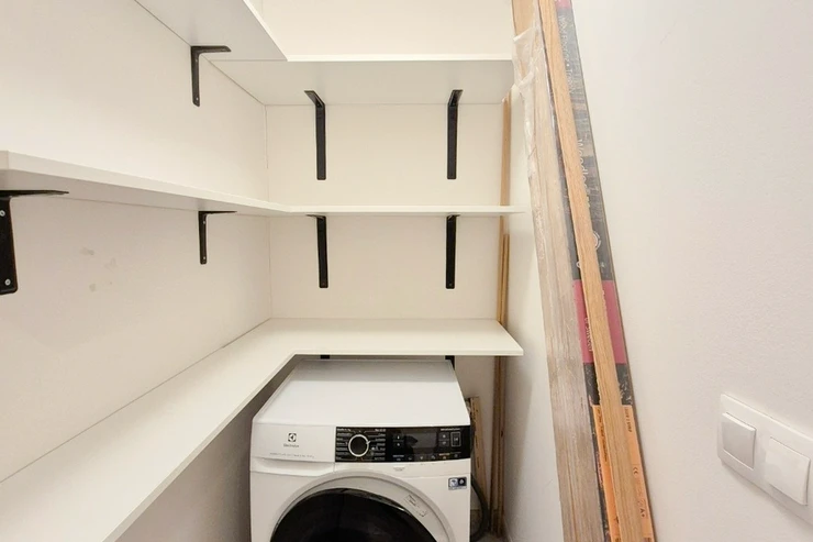 The apartment consists of an open space living room with a fully integrated open-plan kitchen and with an access to the loggia facing a quiet courtyard, one bedroom, one bathroom with a bathtub + toilet, a storage room, and an entry hallway.