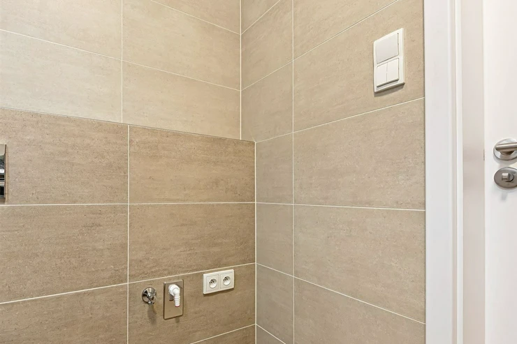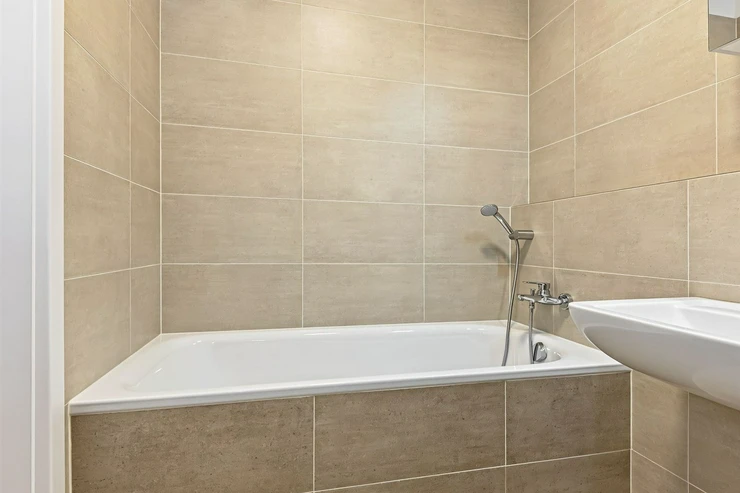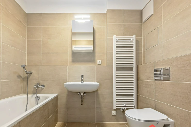 The bathroom has a bathtub, toilet, heated towel rail, and preparations for a washing machine.