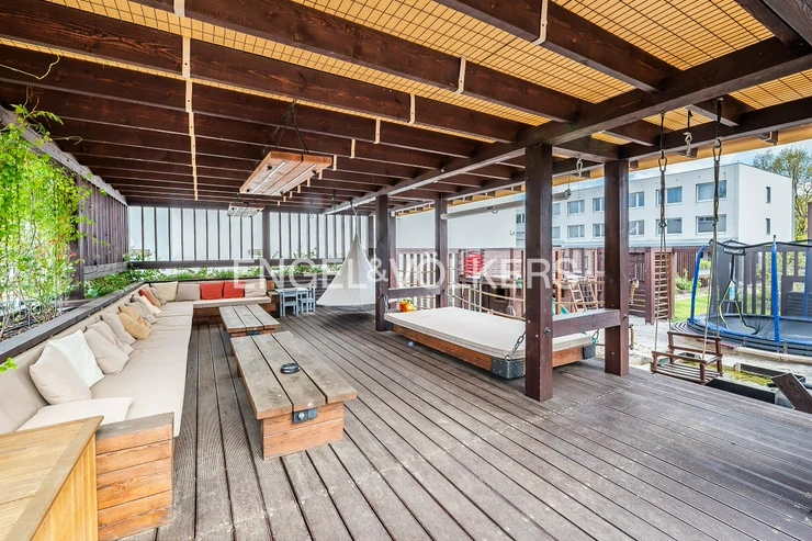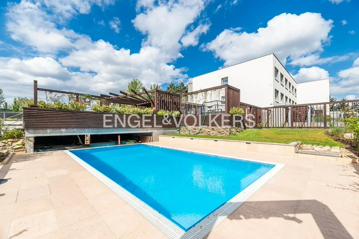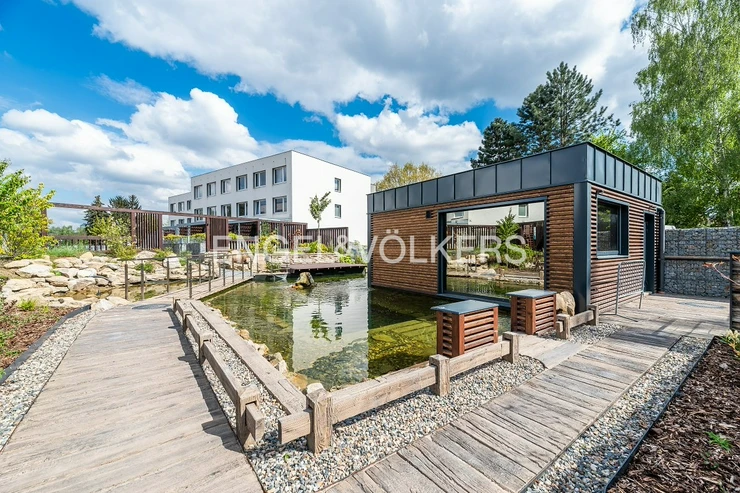 A great advantage and totally unique feature of this home is the shared wellness facilities where the tenant will be able to use the sun terrace, outdoor pool, children's playground, summer kitchen, sauna, barbecue and lounge. At the same time, the location is suitable for lovers of outdoor activities - near the property, there is a path along the Vltava River suitable for cyclists, skaters or runners. At the same time, the connection to Smíchov is very fast, about 15 minutes by bus.
