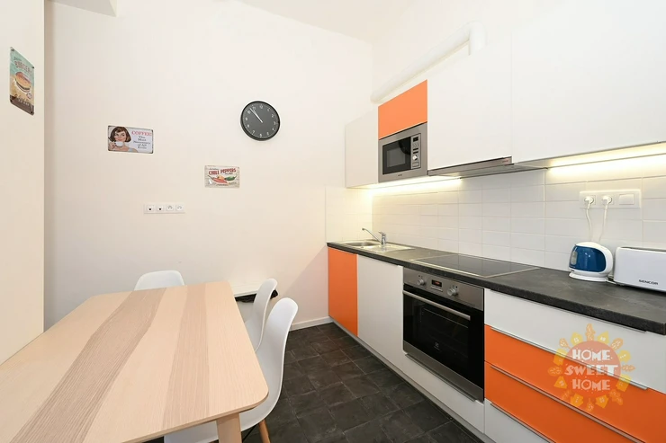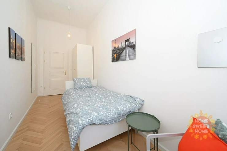 We offer for rent a separate furnished room with a single bed and a total area of 13m2, located on the 3rd floor of a student residence on náměstí Kinských, Prague 5. The room is fully furnished with modern furniture and is lockable. The apartment has a total of 4 rooms, which share a kitchen with a dining area, two bathrooms with a shower and an additional toilet. The apartment is fully equipped including iron, board, and cleaning equipment. Cleaning of common areas is already included in the rent, once a week. High speed internet included in the fees. There is also a completely free fitness room, laundry room with washers and dryers (coin operated), and a common terrace in the courtyard.