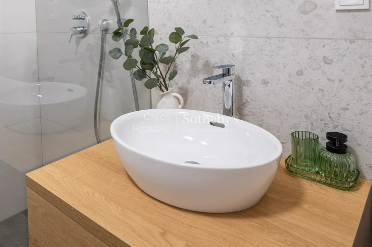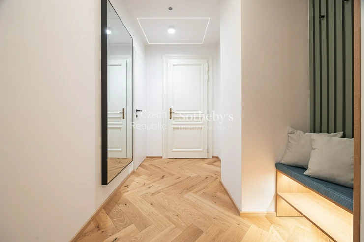 Interiér bytu je navržen s důrazem na nadčasovost a kvalitní provedení. Odpovídá tomu dřevěná podlaha OAKCENT, decentní barevnost a pečlivě vybrané materiály. Součástí vybavení je také moderní kuchyňská linka a vestavěné úložné prvky.
