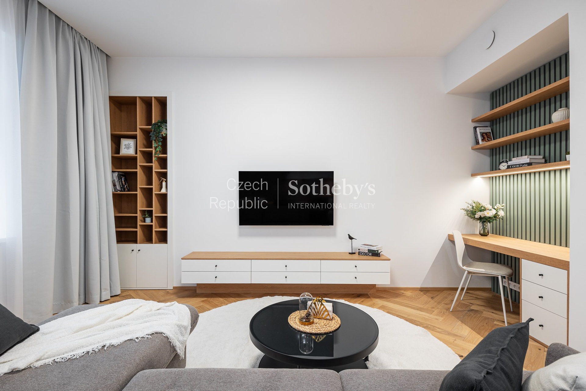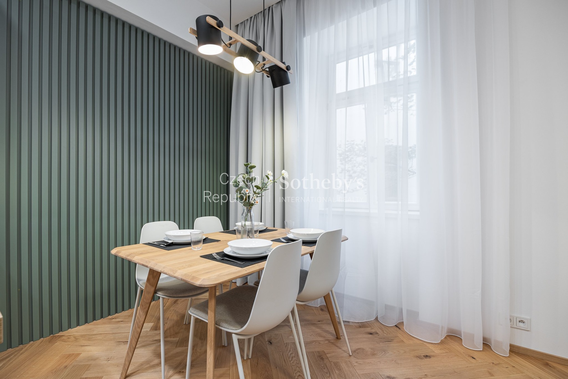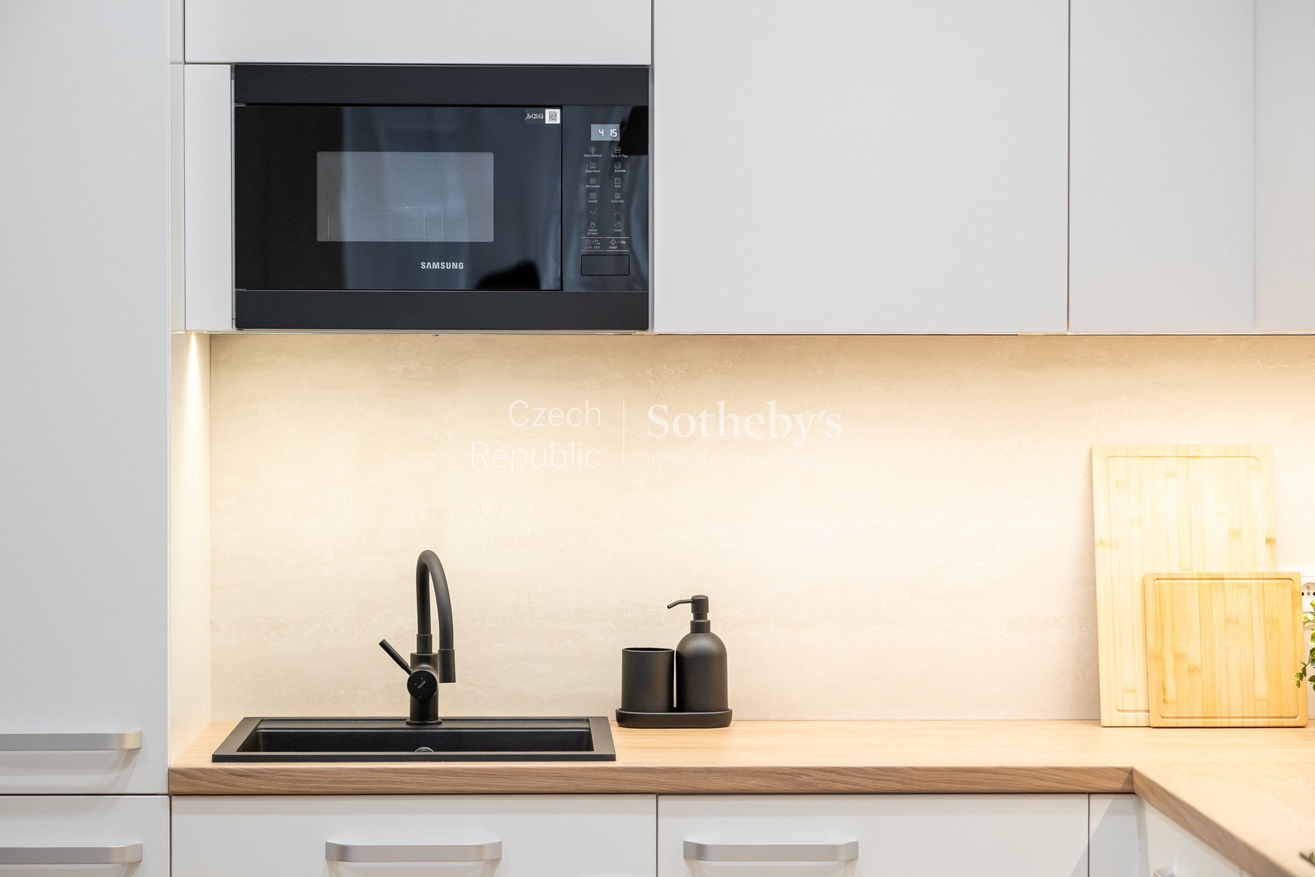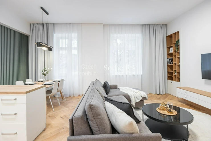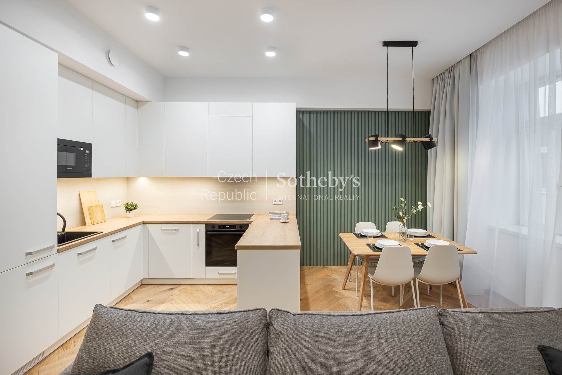 Sotheby’s International Realty Czech Republic presents a modern 1-bedroom apartment for rent with a total floor area of 73,50 sqm, located on the third floor of the newly renovated Sovova Residence in the sought-after district of Karlín.