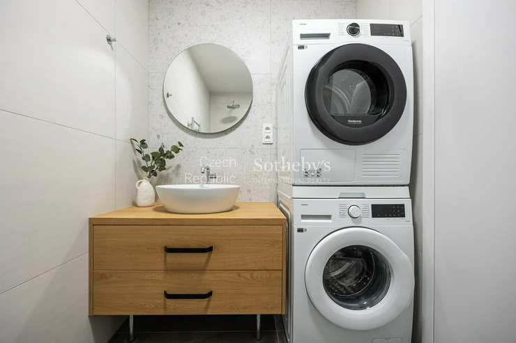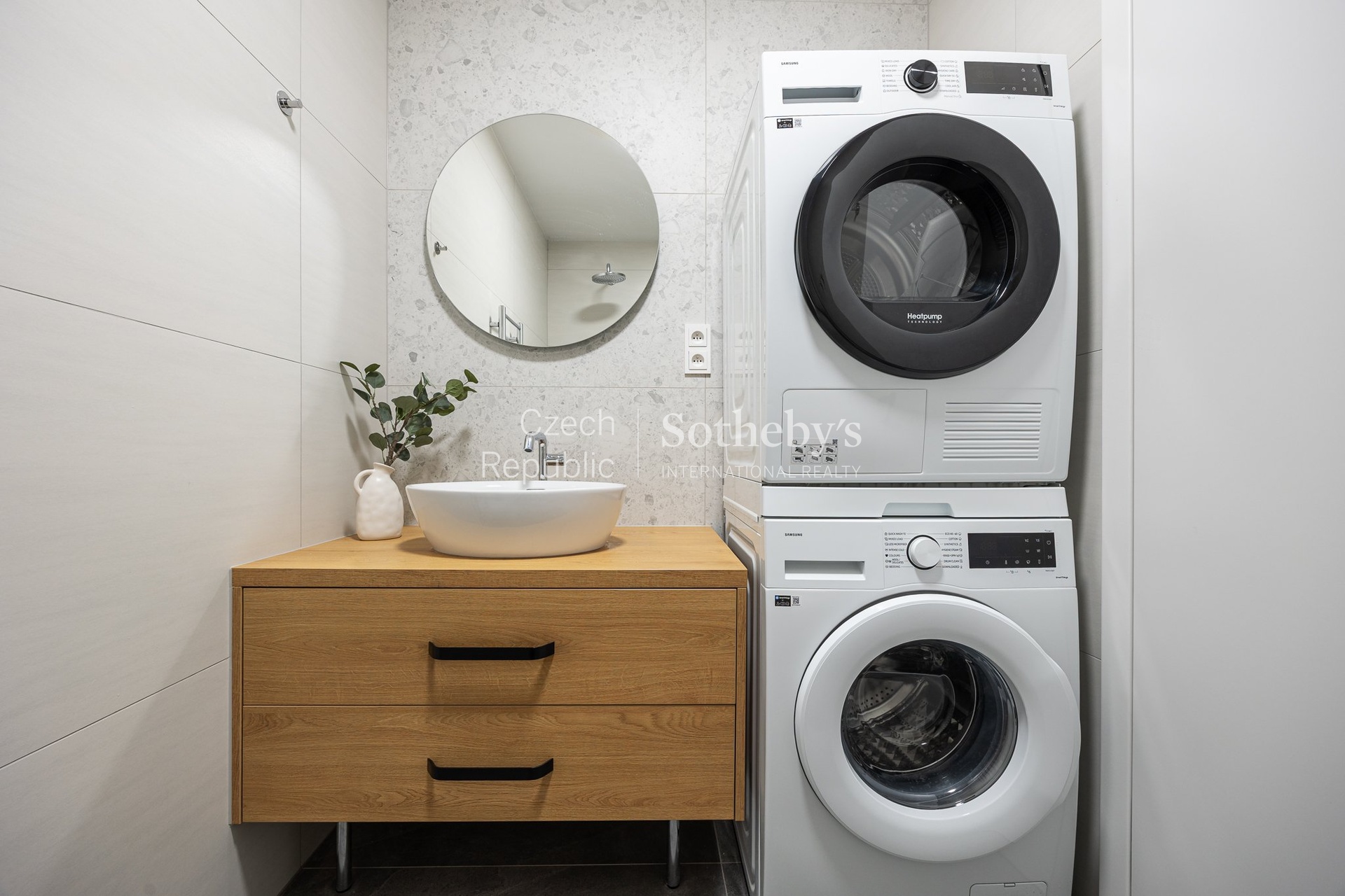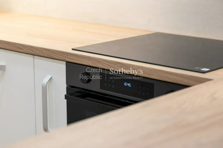The technical features include underfloor heating and cooling, heat recovery ventilation and the LOXONE smart home system, enabling control of heating, cooling, shading and lighting. As a result, the apartment offers a comfortable climate throughout the entire year. The kitchen is fitted with built-in Samsung appliances; the bathroom includes a Samsung washer and dryer; and the living room is equipped with a multimedia TV.