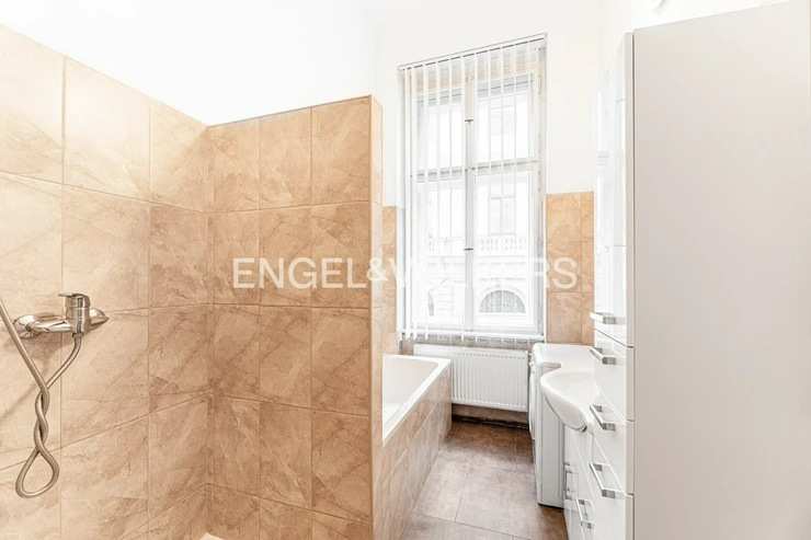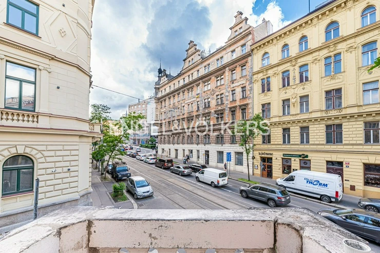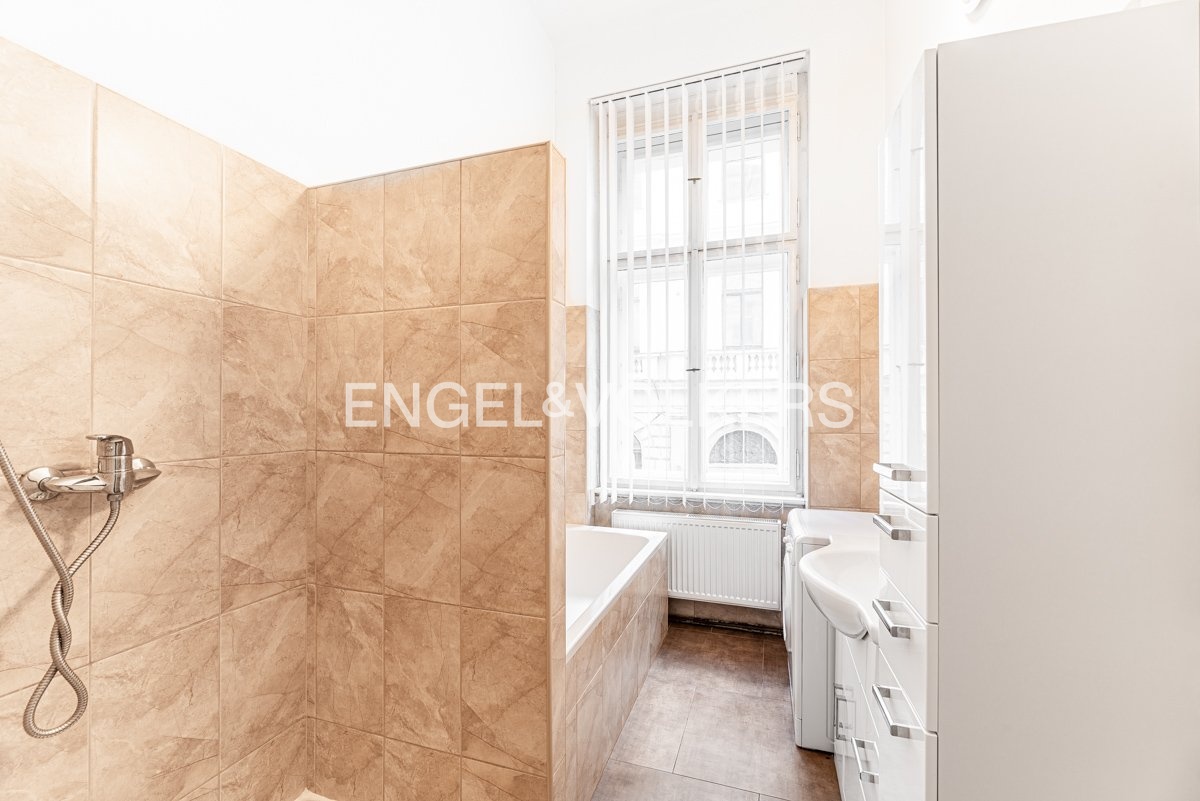 In a historic corner house built in 1905 in the centre of Prague, a spacious 2+1 apartment is now available for rent. The apartment is located on the first floor. The apartment consists of a shared entrance hall, bedroom, spacious living room with access to the balcony, bathroom with washing machine, bath and shower, separate toilet and fully equipped kitchen with dishwasher.