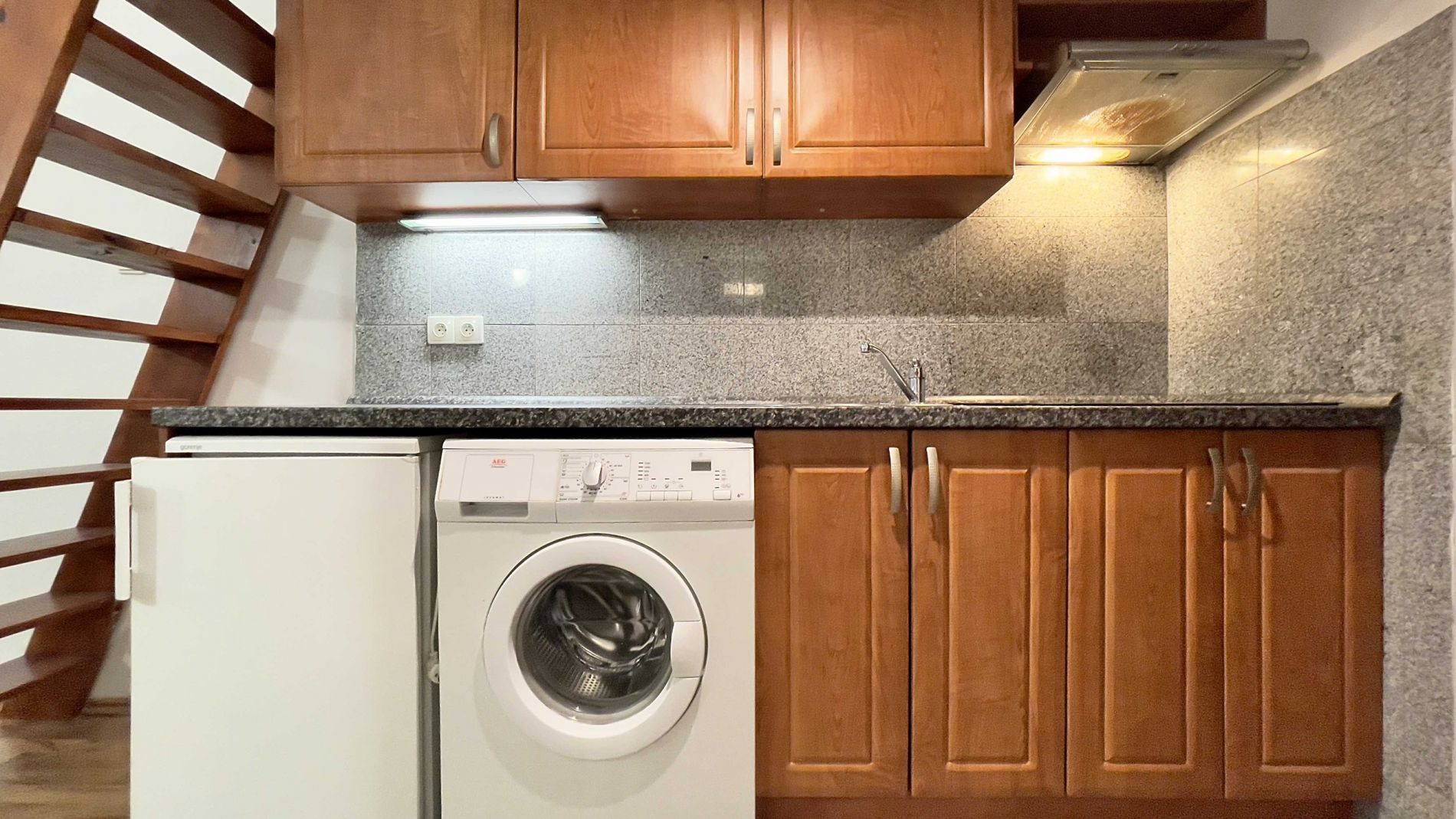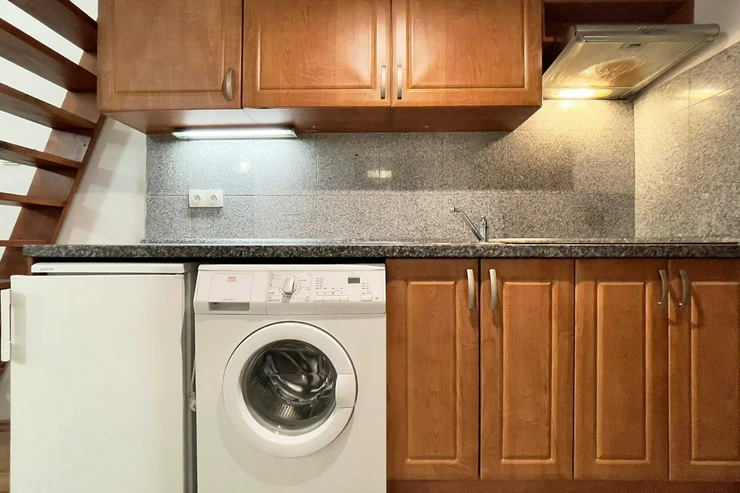 The sunny apartment after repair is located on the 2nd floor of the house. Kitchen line with stainless glass-ceramic hob, washing machine, fridge, stainless steel fireplace hood, bathroom (bath, washbasin, toilet).
