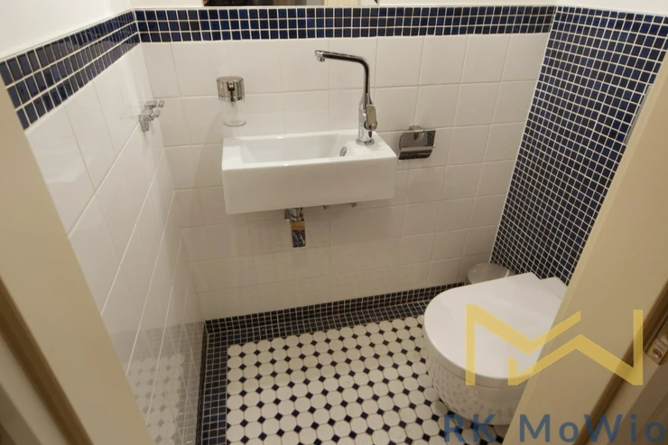 The apartment features an entrance hall, a spacious living room with a kitchenette and dining area, one colorful bedroom with an en-suite bathroom (equipped with a bathtub, sink, and toilet), and a guest toilet. Additional apartment amenities include a kitchen with a fridge-freezer, electric and microwave ovens, a glass-ceramic hob, and an extractor hood; connections for a washer and dryer, preparation for high-speed internet, wooden floors, and tiling.