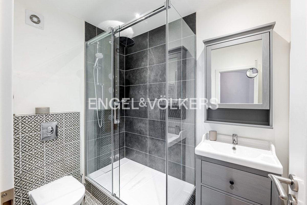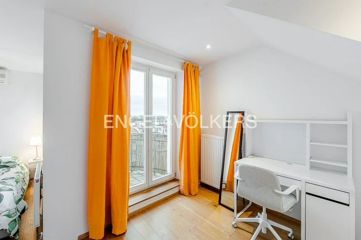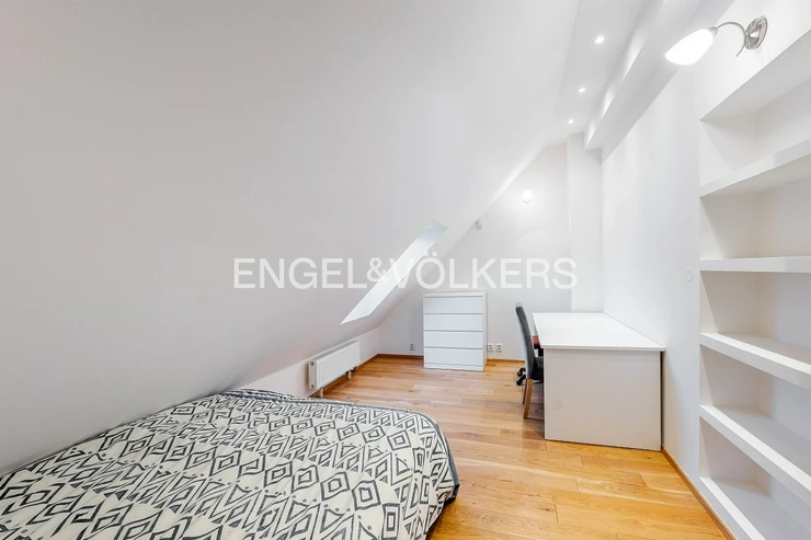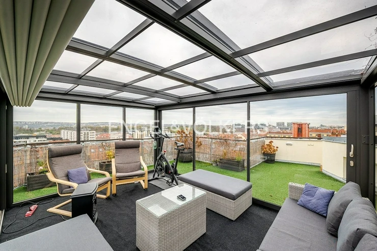 The interior of the apartment includes a living room with a fully equipped kitchen, dining area and access to a large roof terrace, which is equipped with a winter garden. This glazed part of the terrace is heated, has roller shutters and provides an ideal environment for working or relaxing even during winter months. You will also find a rotoped, storage space, outdoor seating and a barbecue. The master bedroom has a dressing room, en-suite bathroom (shower, toilet) and a balcony. The other two bedrooms share a second bathroom (bath, shower, toilet), one of which also has a balcony. The apartment is equipped with air conditioning in all rooms, solid wood floors, a skylight in the kitchen, a gas boiler, a washing machine, a dishwasher, an induction hob and a TV. Parking is provided in a separate garage in the yard, which is spacious enough for an SUV and which is available for 4,500 CZK/month.