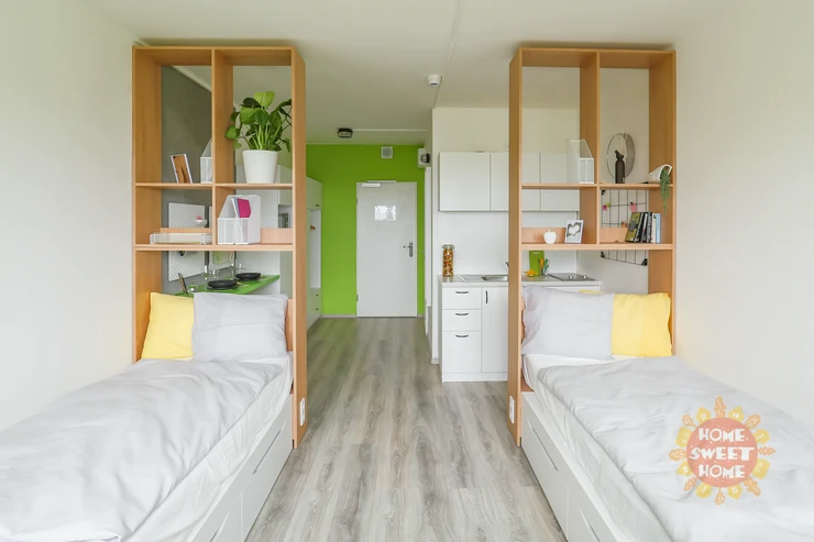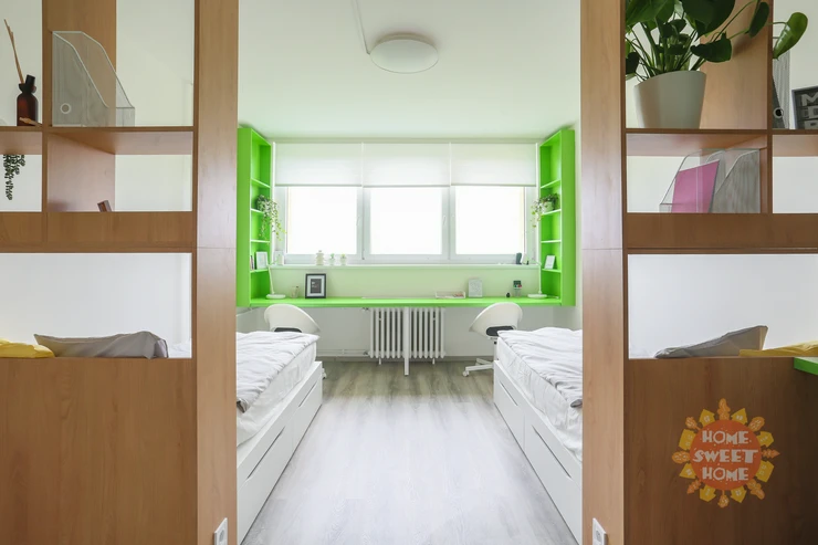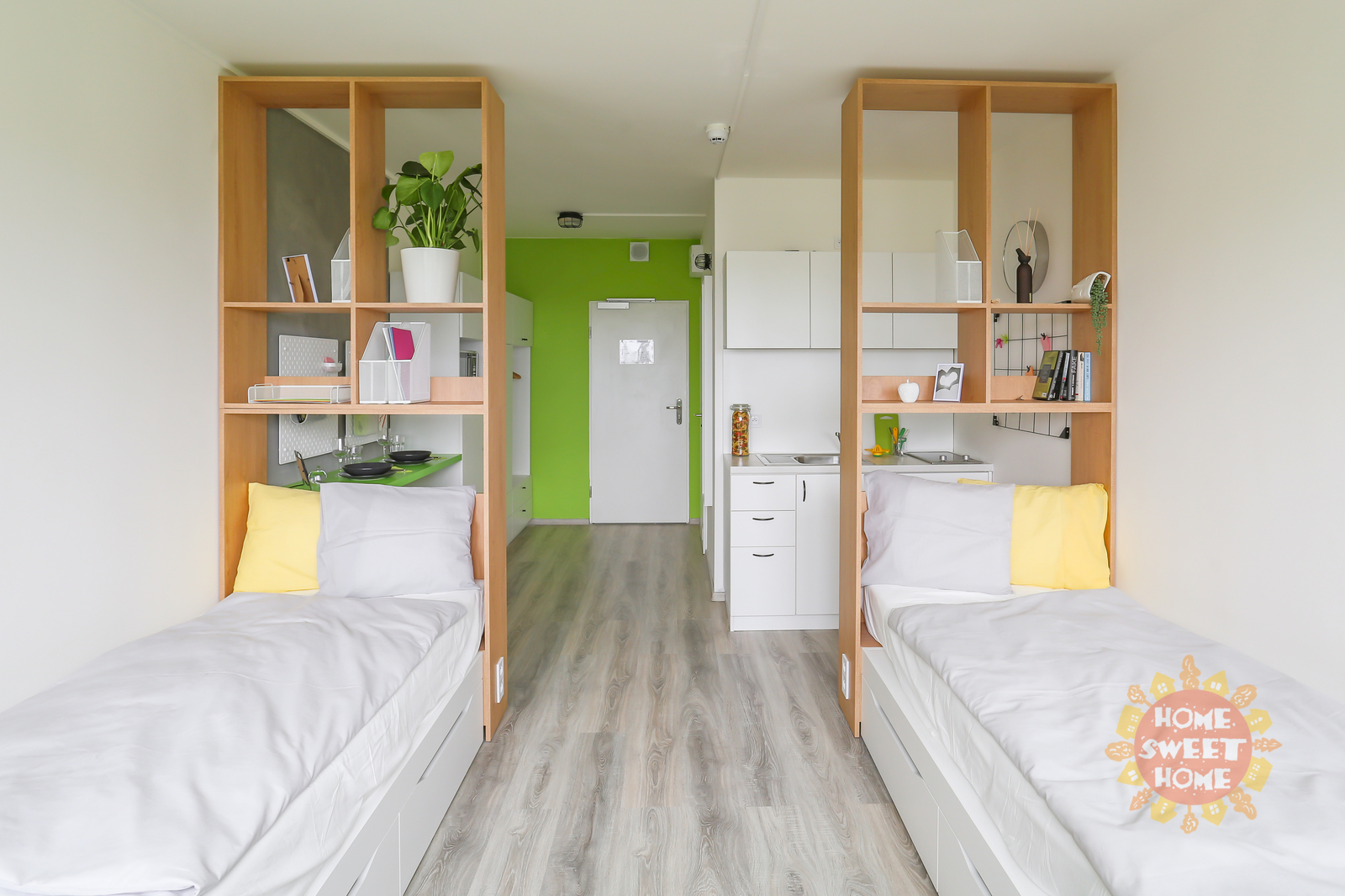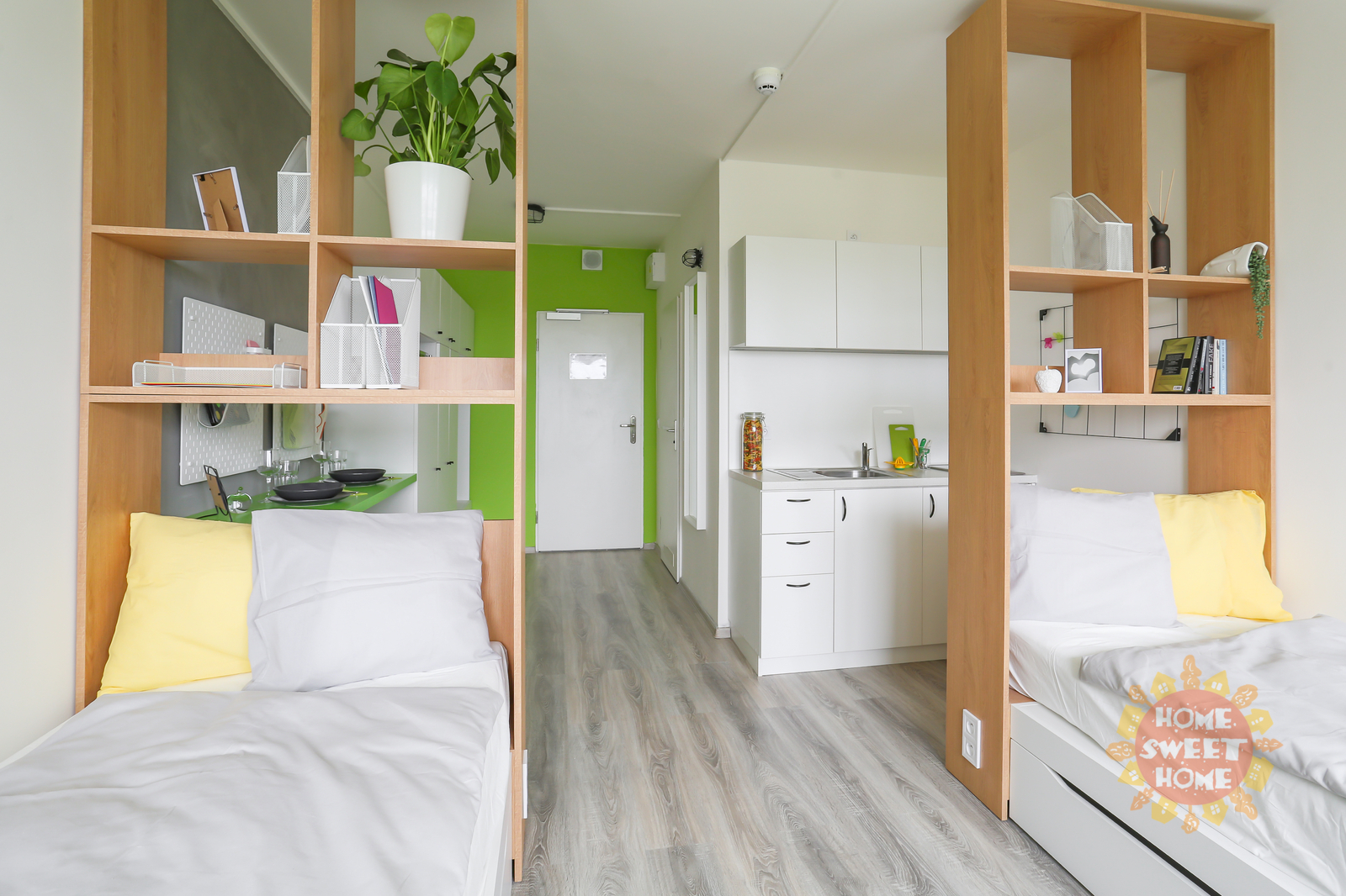 We offer several rooms in the residence, for singles or couples – the actual appearance of the room may vary depending on the specific design. The specific type of room, its location, and floor will be specified based on your request, including the date and length of your stay. The minimum rental period is three months. The price includes all fees (electricity, water, heating, high-speed internet, and use of common areas).