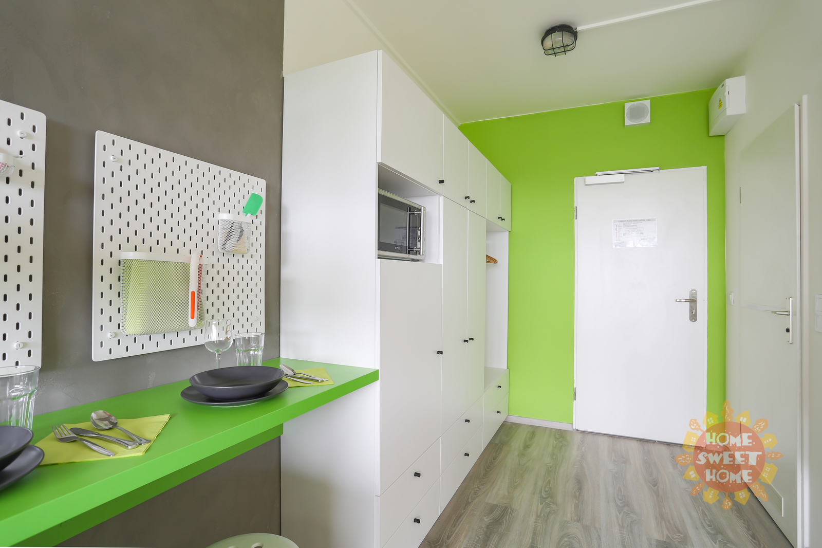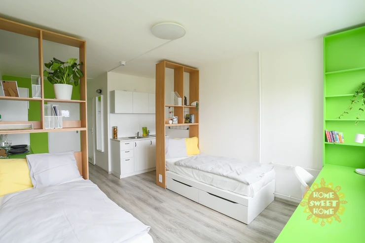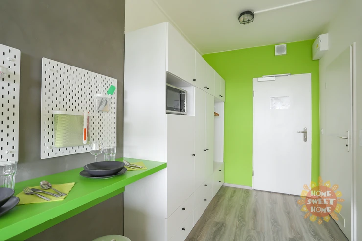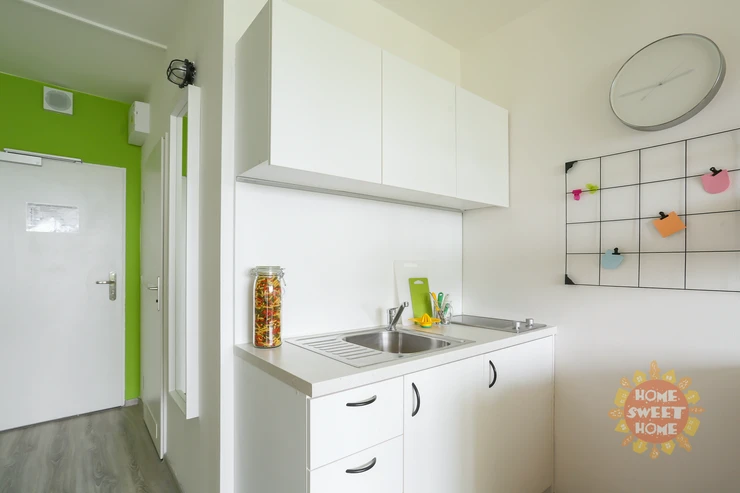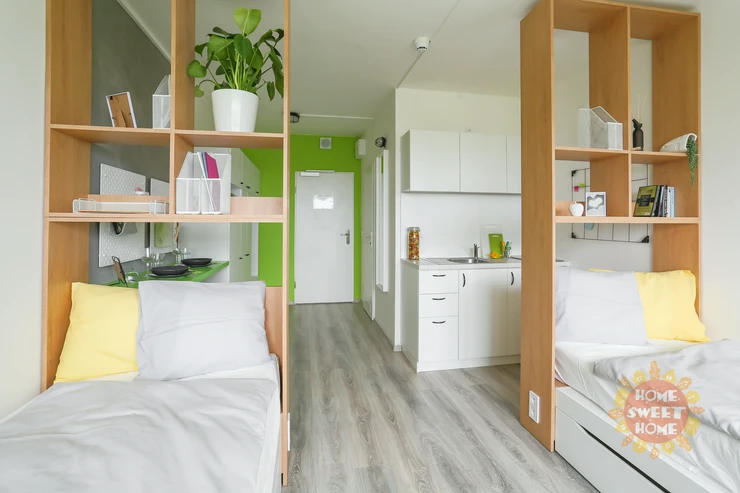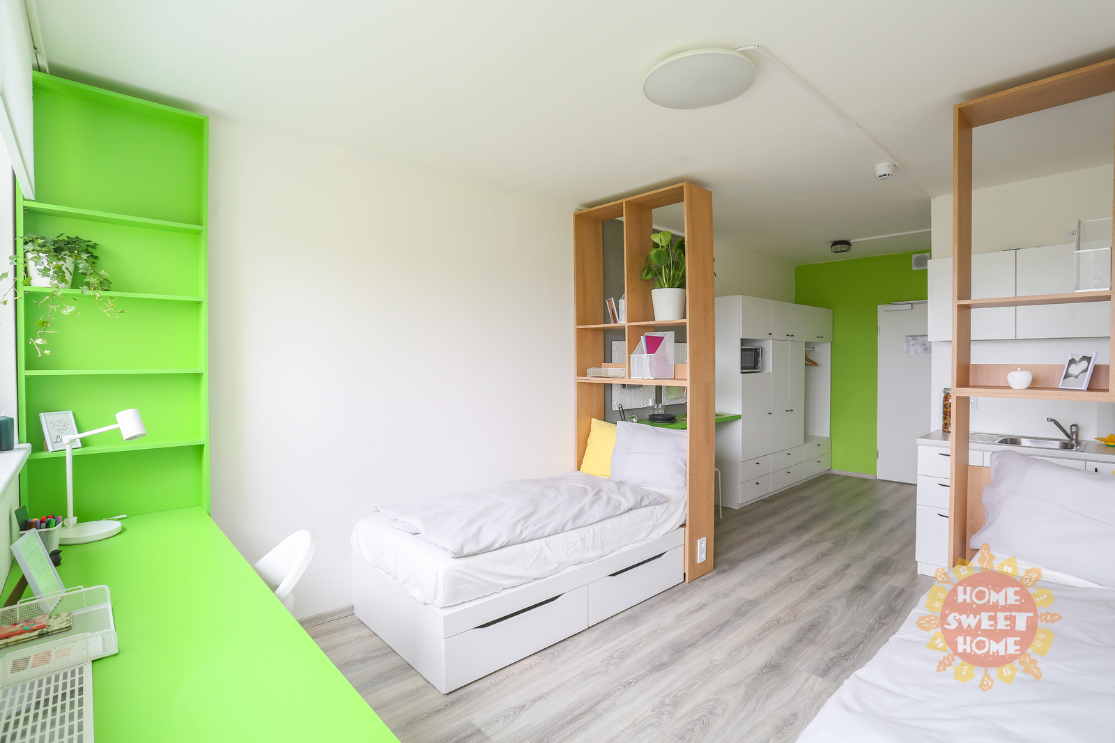 We offer several rooms in the residence, for singles or couples – the actual appearance of the room may vary depending on the specific design. The specific type of room, its location, and floor will be specified based on your request, including the date and length of your stay. The minimum rental period is three months. The price includes all fees (electricity, water, heating, high-speed internet, and use of common areas).