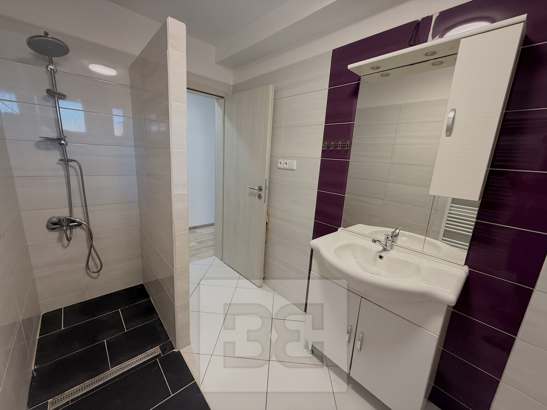 • Bathroom with shower, sink, and toilet