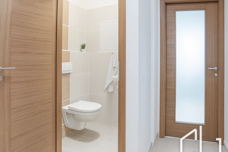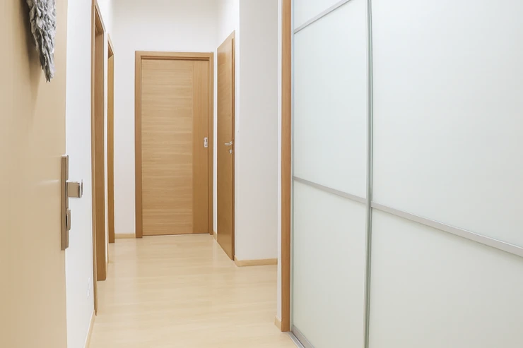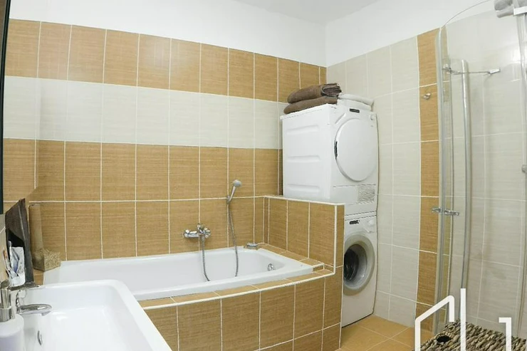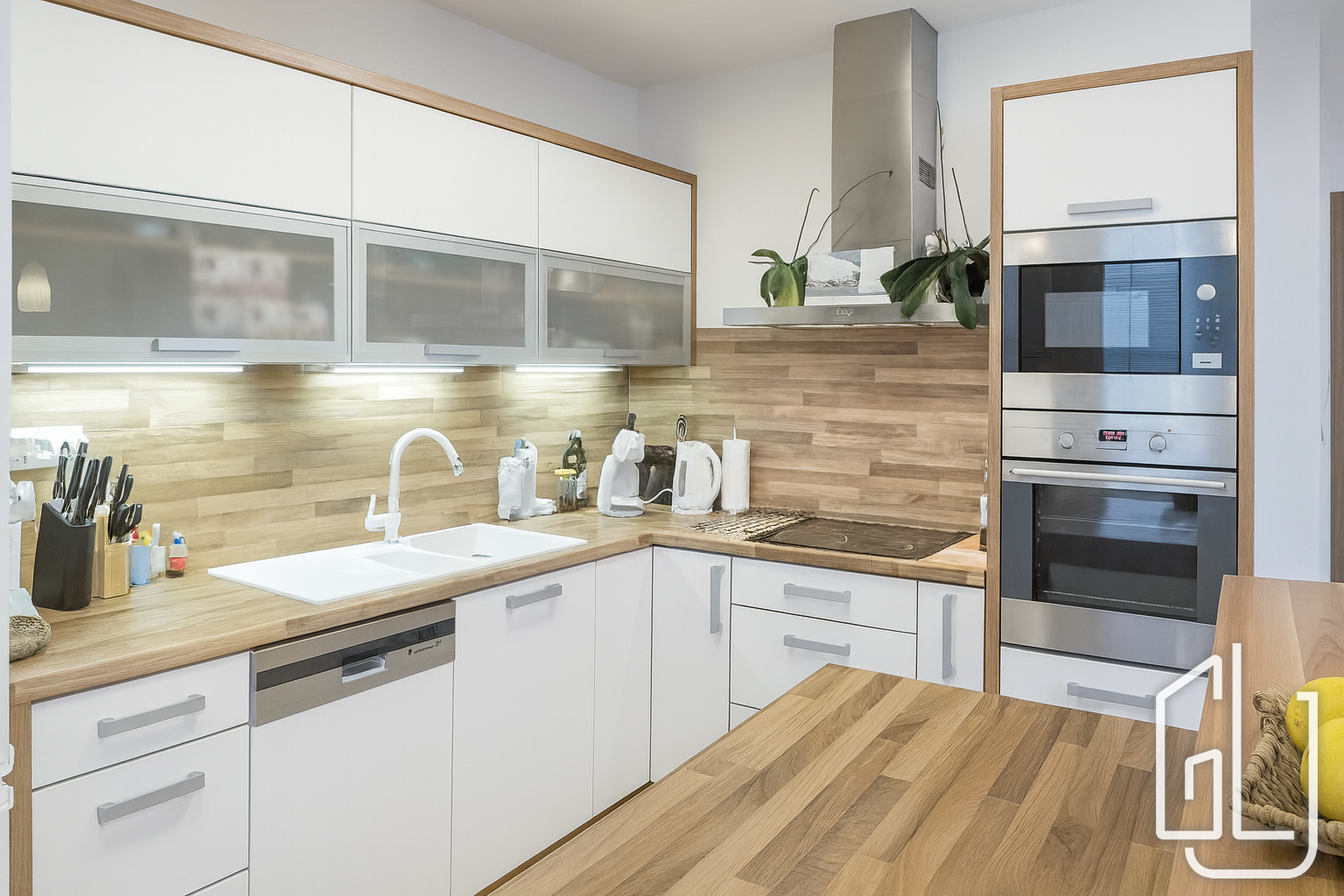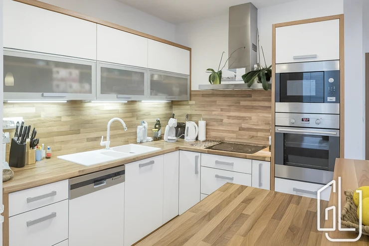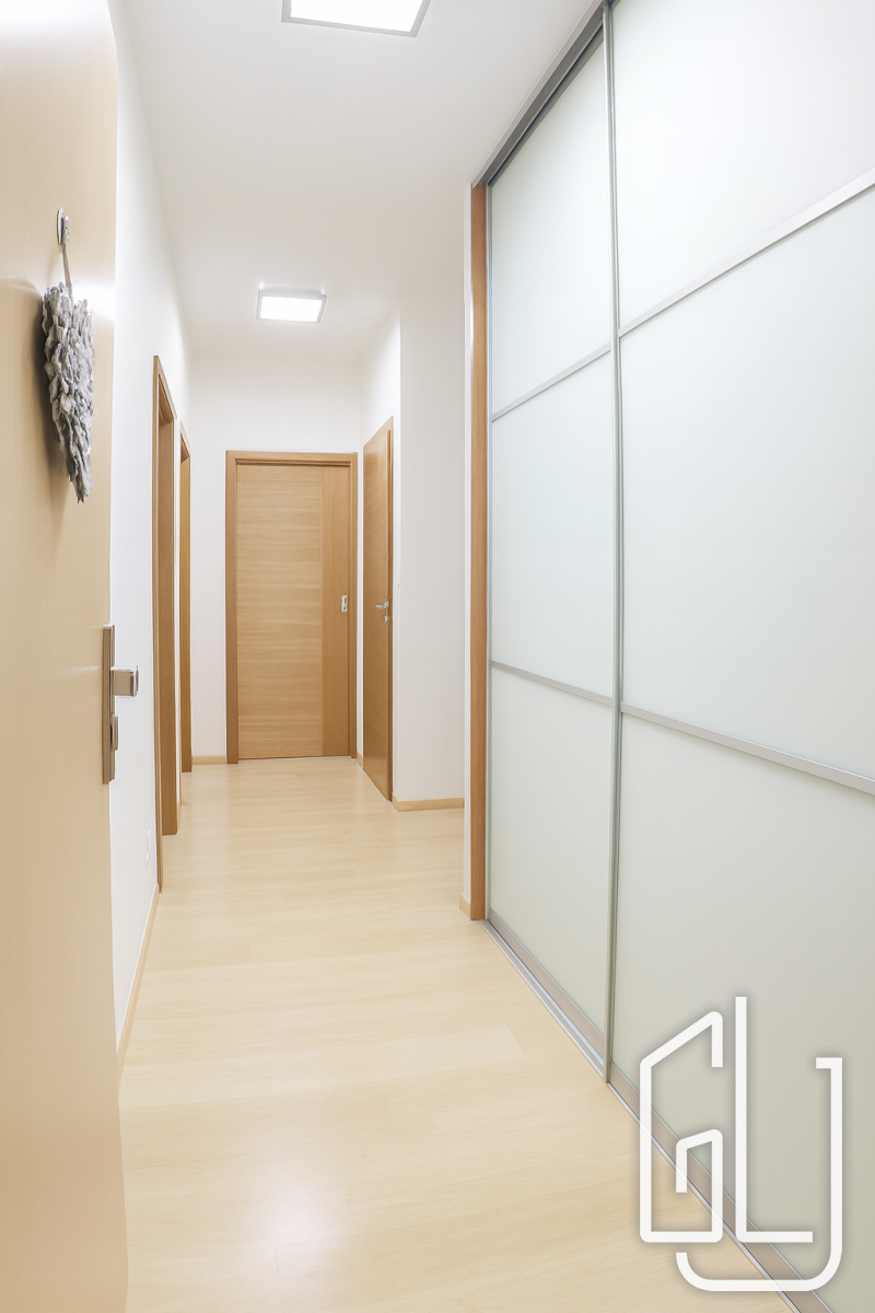 Byt je vybaven dvěma vestavěnými skříněmi a moderní kuchyňskou linkou s vestavnými spotřebiči Electrolux (varná deska, horkovzdušná trouba, mikrovlnná trouba, myčka, digestoř).
