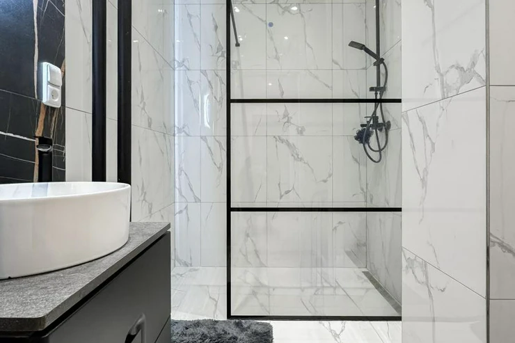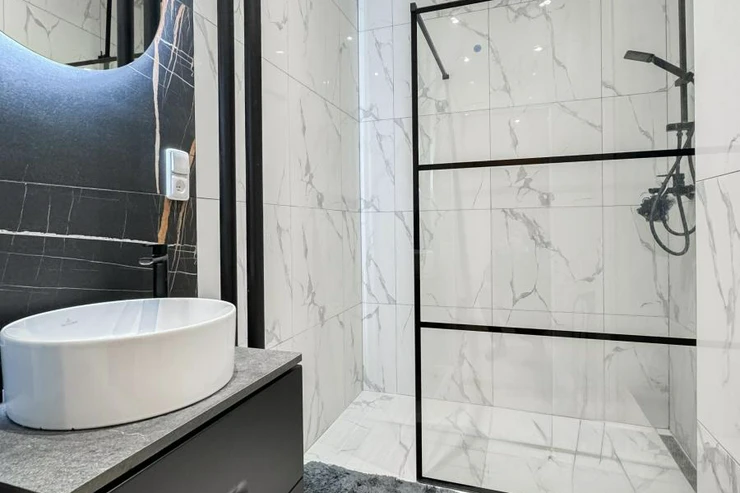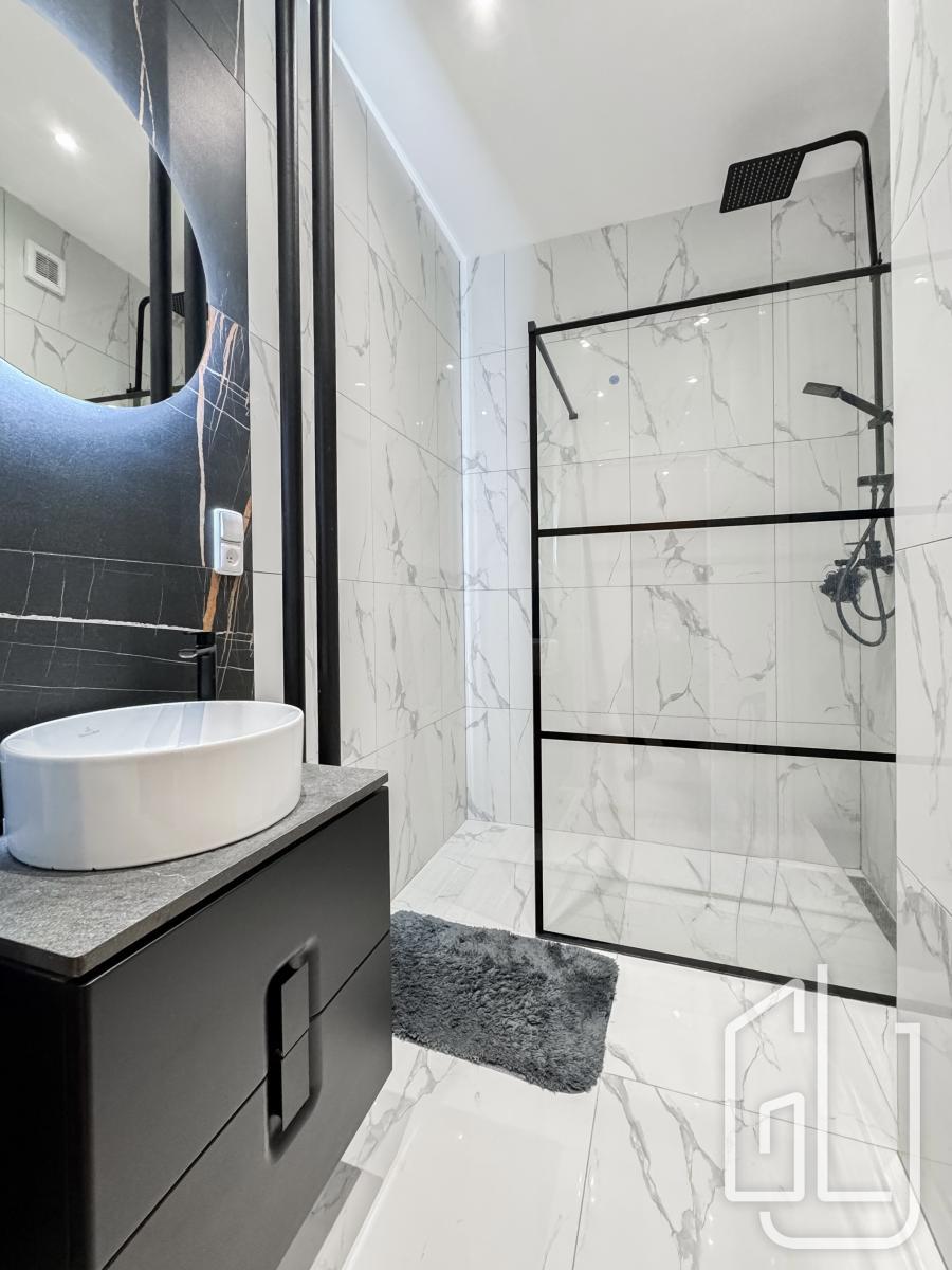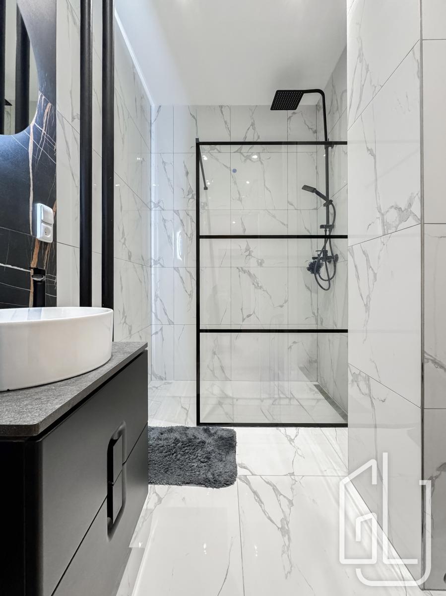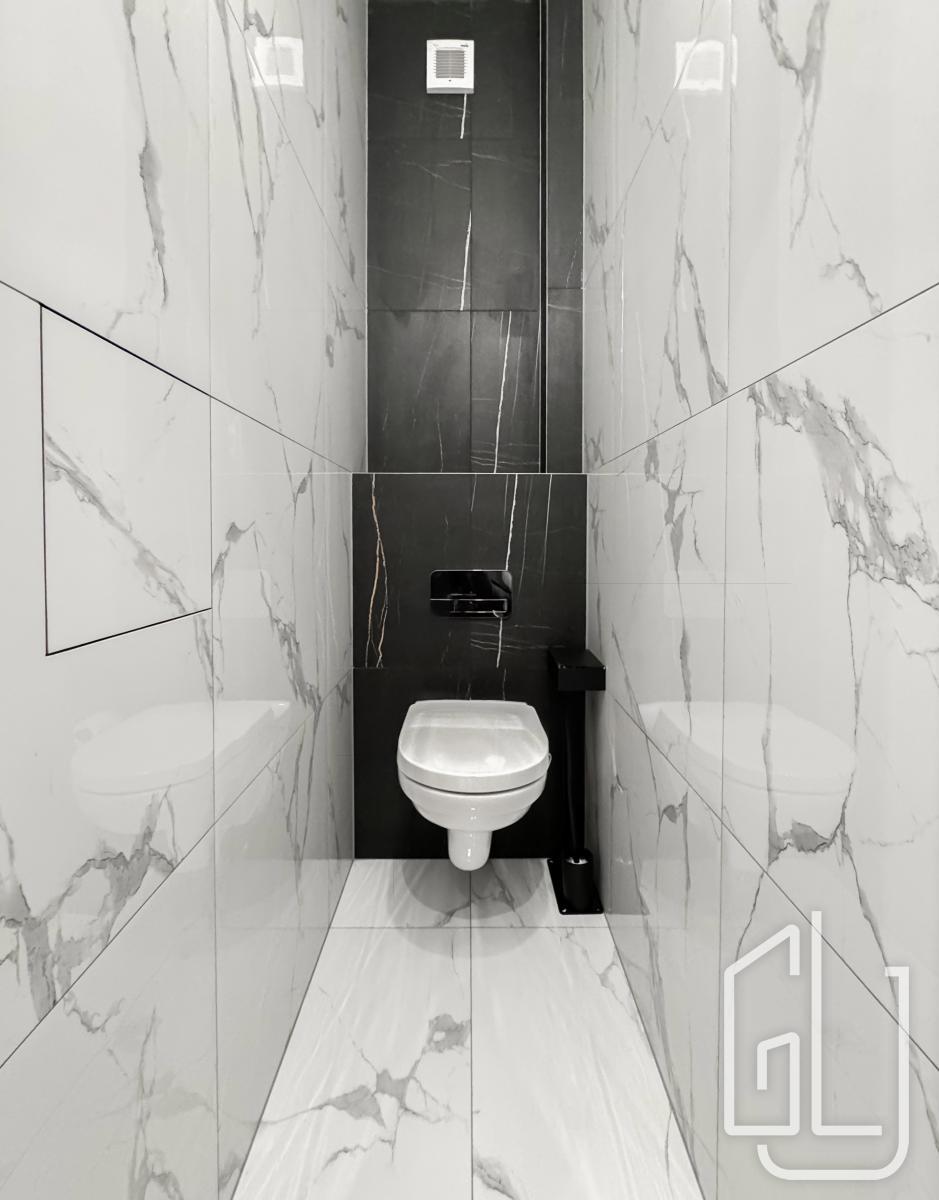 Koupelna a toaleta jsou po kompletní rekonstrukci ve vysokém standardu, s použitím značkových materiálů Villeroy and Boch a Hansgrohe. Byt je vybaven novou pračkou, TV a je plně zařízený k okamžitému užívání.