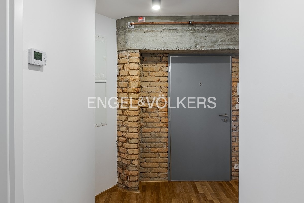 A brand new studio apartment is available for rent from 1. 12. 2025, located on the fifth floor of a newly built extension. The layout of the apartment consists of an entrance hall, bathroom with shower and toilet, and a main living area combining a living room and a fully equipped kitchenette. The main advantages include air recovery, high ceilings, preserved wooden beams, and a spacious terrace.