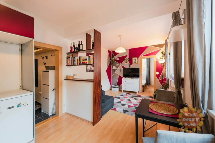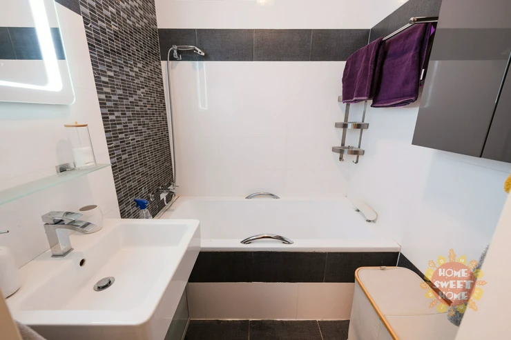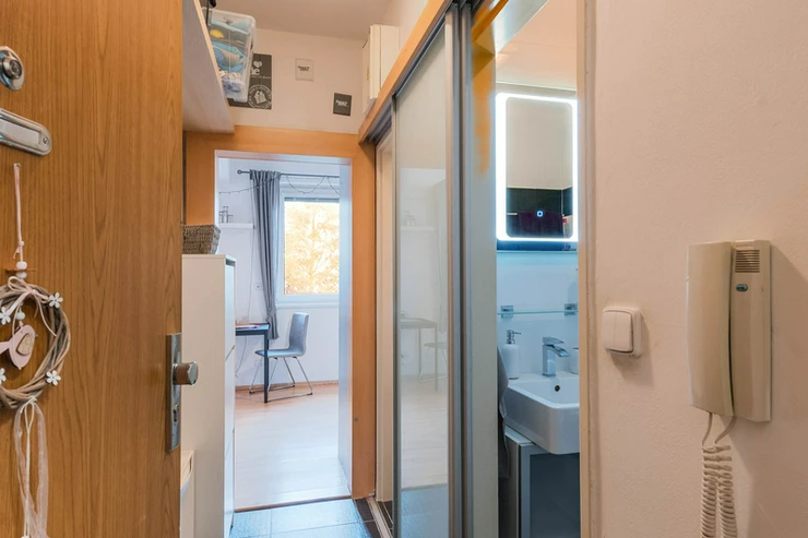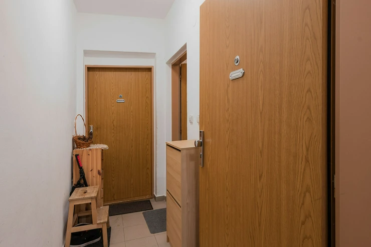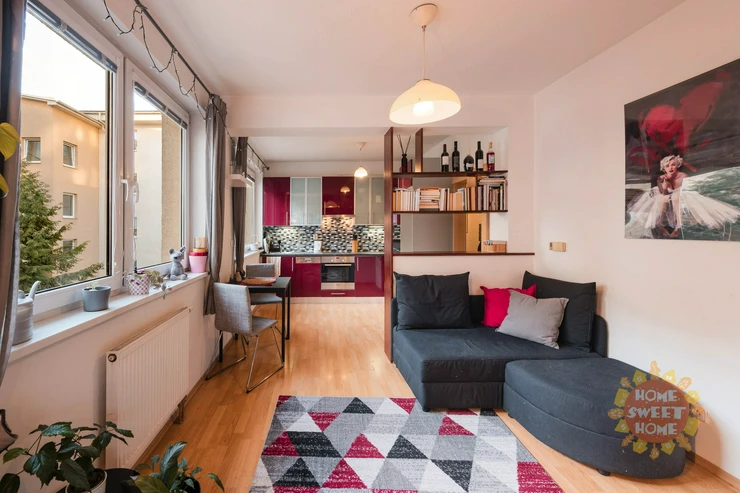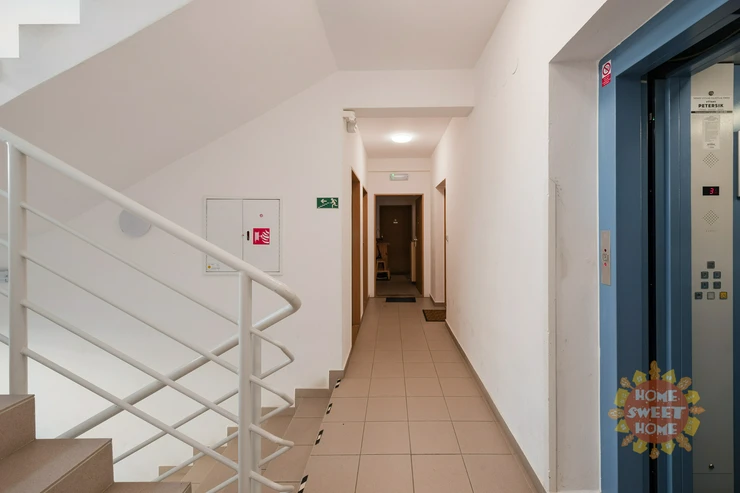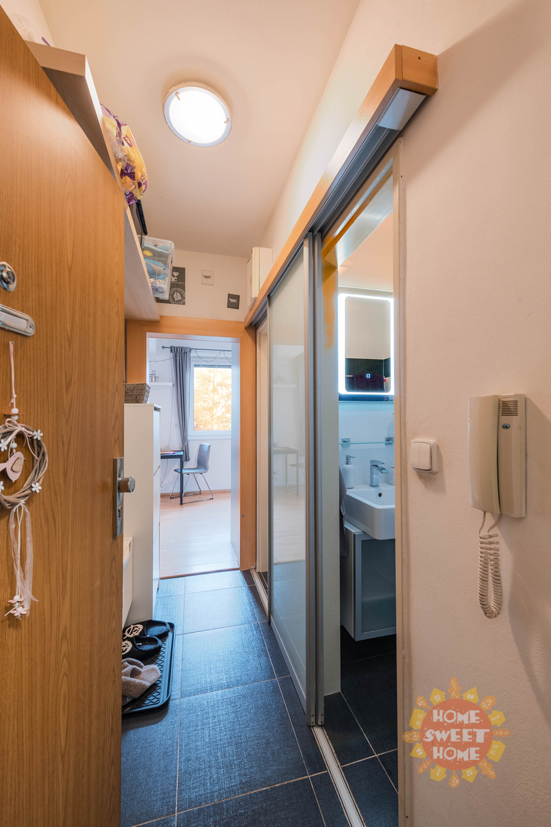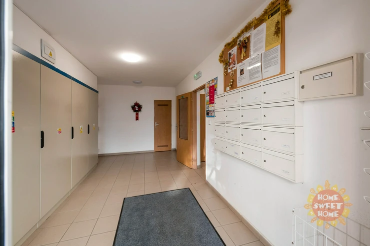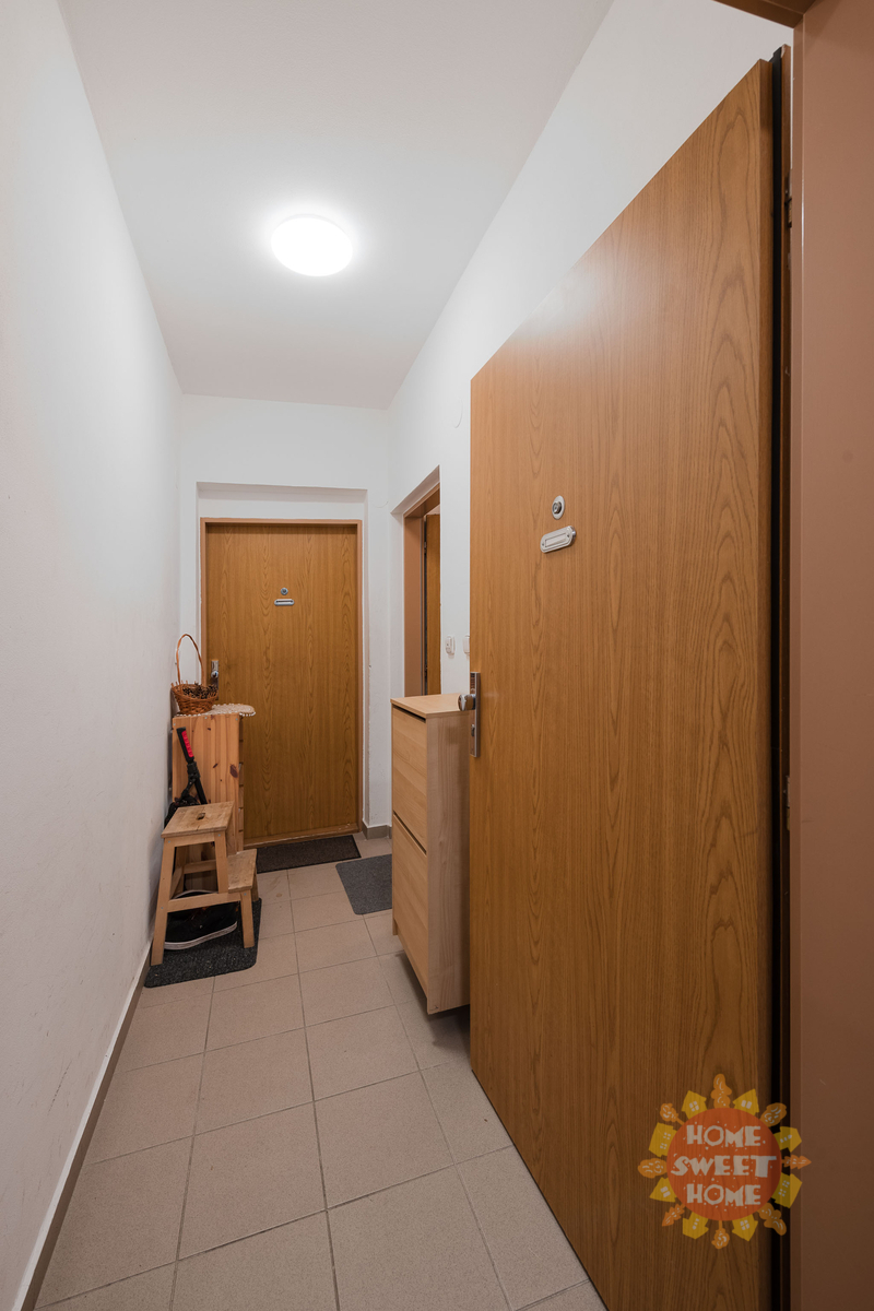 The apartment consists of an entrance hall, living area with a fully equipped kitchenette with high-quality electrical appliances (built-in electric oven with ceramic hob, dishwasher, refrigerator with freezer, microwave oven), bathroom with bathtub and washing machine, separate toilet. The bathroom and toilet have underfloor heating. The apartment is heated by central heating, the floors are tiled and laminate. Parking space available for a monthly fee of CZK 700.