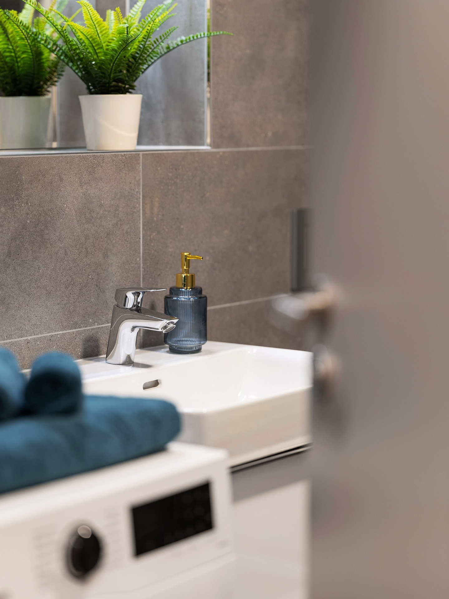 The bathroom is modern, fresh, and shower-ready.