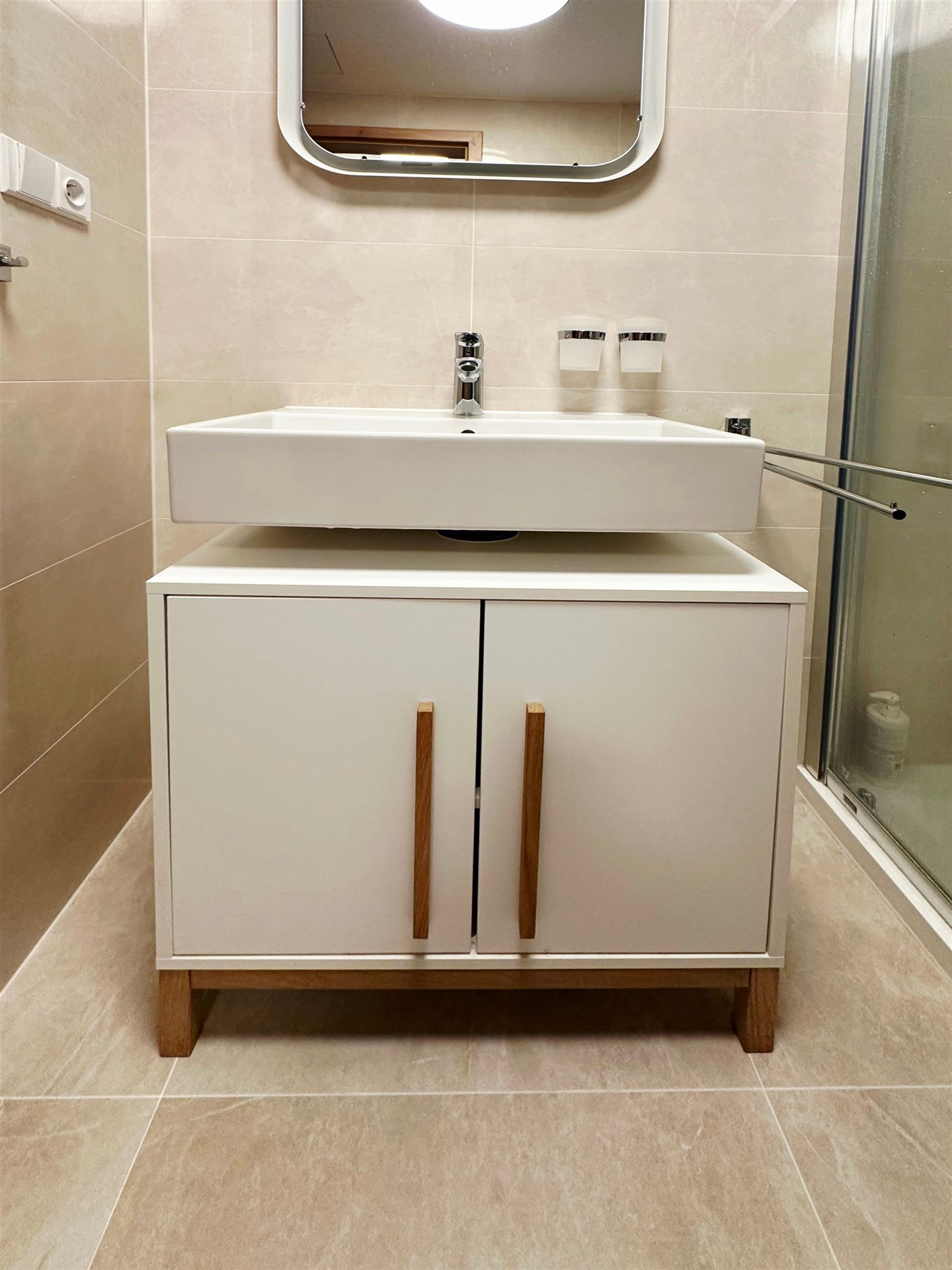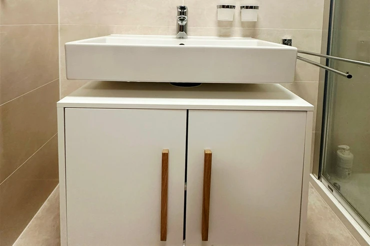 The kitchenette is fully equipped: oven, electric hob, extractor hood, dishwasher. Addition of a refrigerator with freezer negotiable. The apartment also has a built-in wardrobe in the hallway, a wardrobe in the bedroom, and bathroom furniture under the sink, all shown in the photos.