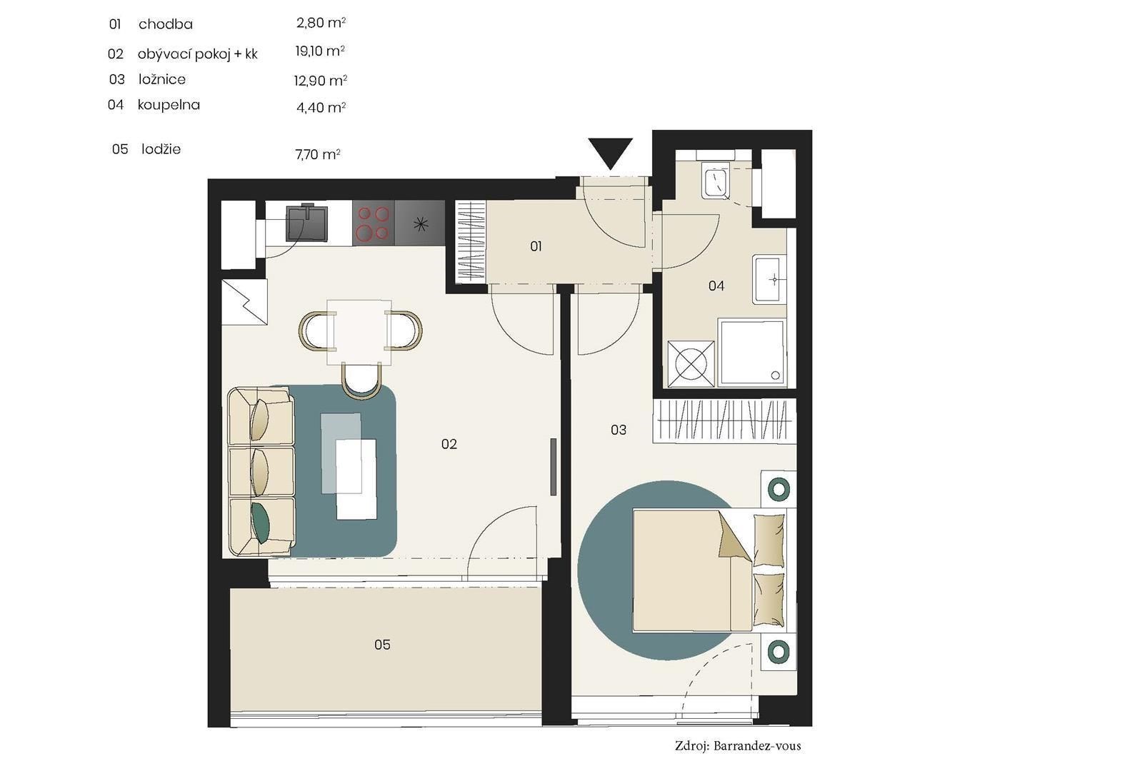 The apartment is entered through the hallway, which is the crossroads to all separate rooms: a living room with a kitchen and access to a generous loggia, a bedroom with a view of the quiet garden park, a bathroom with a shower, sink, and toilet. Dimensions of individual spaces are available in the floor plan.