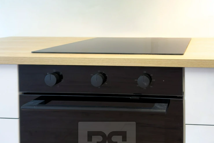 The unit is situated on the first floor and features a bright, spacious living area with a modern kitchen equipped with built-in appliances (dishwasher, oven, induction hob, extractor hood), a large bedroom, and a bathroom with a bathtub and toilet.