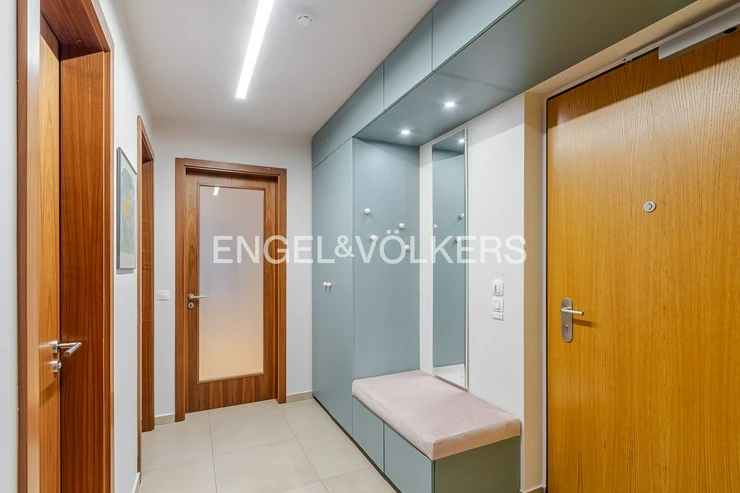 The apartment is equipped with electrically operated external blinds, air conditioning, satellite connection, and a security system. Residents can also use a private garden oriented towards the Malovanka nature park.