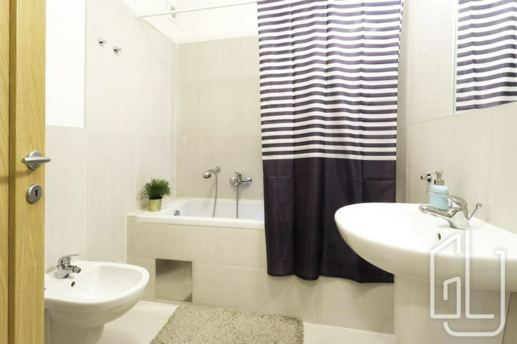 Kuchyně je vybavena lednicí s mrazákem, varnou deskou, digestoří a dostatkem úložného prostoru. Byt je nabízen plně zařízený včetně veškerého nábytku, který zajišťuje pohodlné bydlení bez nutnosti dalších investic.