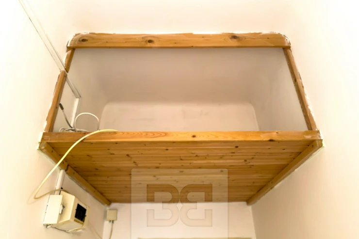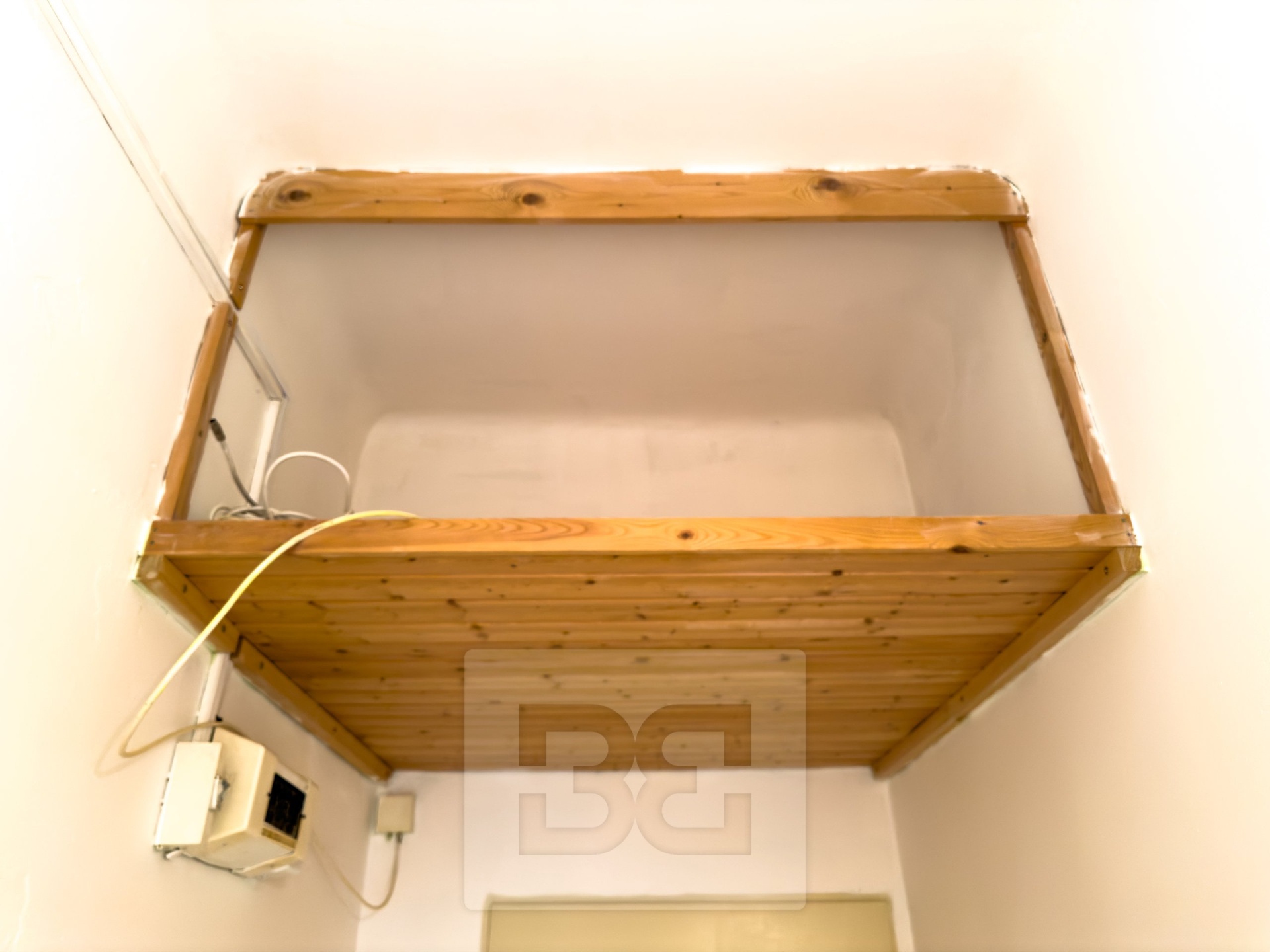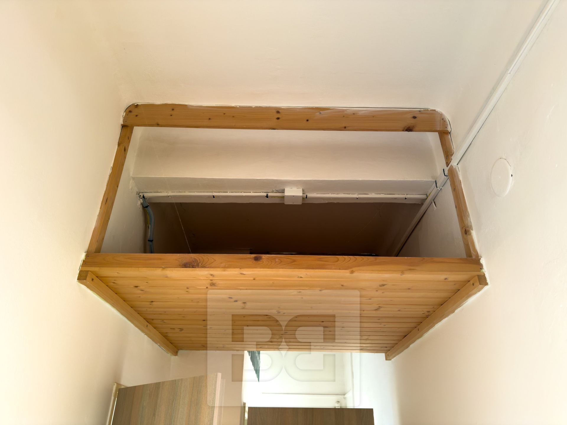 The layout consists of a spacious separate bedroom, a kitchen area with a dining space, a bathroom with a bathtub, a separate toilet, and a practical storage room providing additional space. Another great advantage is the cleverly built-in storage space located high under the ceiling in the hallway.
