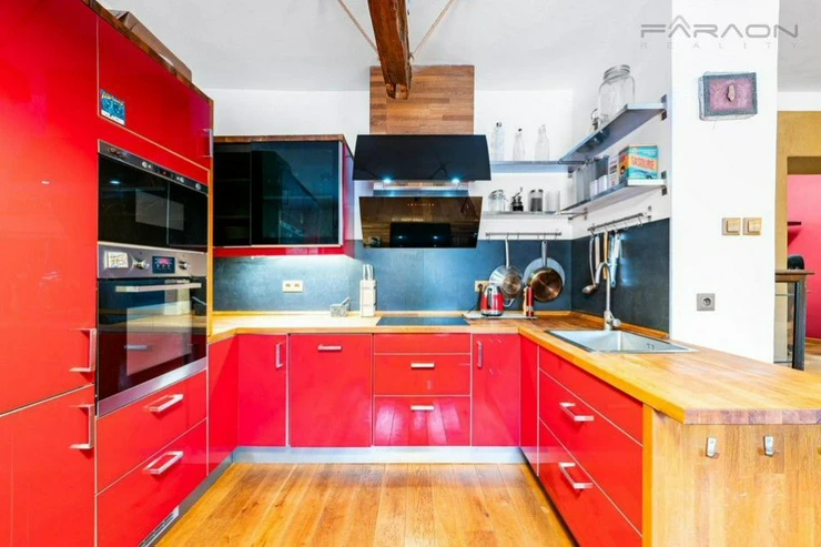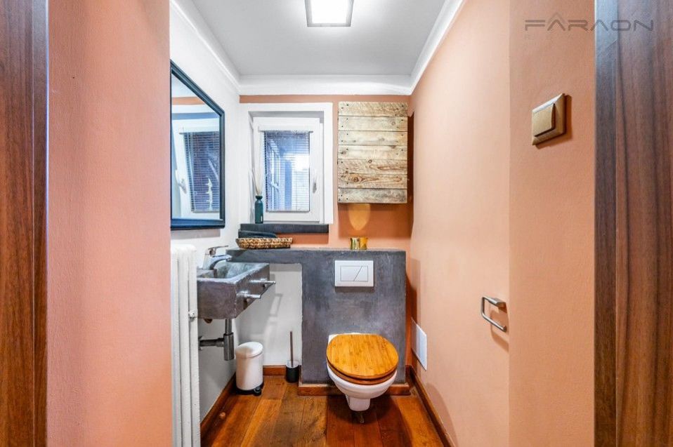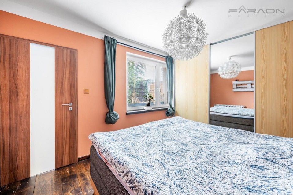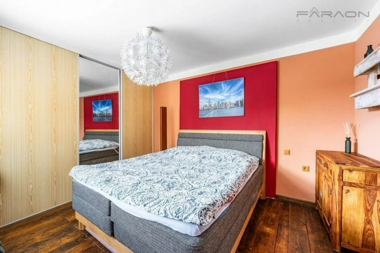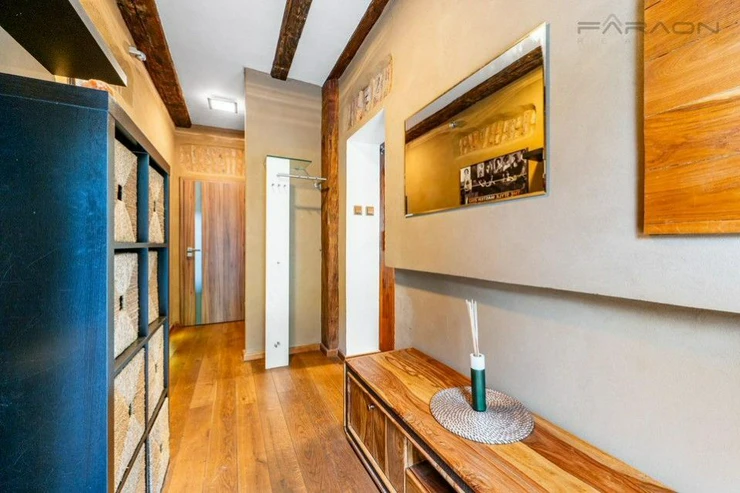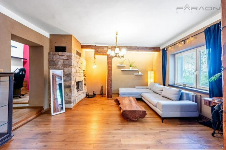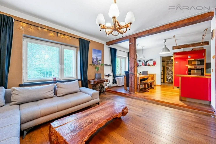 The complete equipment includes a modern kitchen in a red design equipped with appliances, wooden floors, solid wooden furniture, a recently purchased sofa bed, a bathroom - Moroccan stucco (hand-sanded), built-in wardrobes, blinds on all windows of the apartment, a Gorenje washing machine, an LG dryer, a functional fireplace. The rent includes a parking space and the possibility of using the owner's cellar.