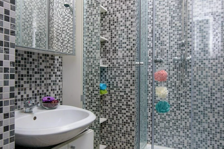 The apartment is located on the 1st floor of a well-maintained building on a quiet street. It features a fully equipped kitchen area (fridge with freezer, microwave, dishwasher, oven with stove, range hood, kitchenware) and a sofa. There are two bathrooms with showers and two separate toilets. A washing machine is also available.