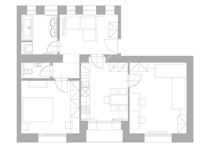 Dispozice: obytná hala (lze využít i jako třetí pokoj), kuchyň s jídelnou, dvě samostatné ložnice, koupelna s vanou, samostatná toaleta, lodžie. K vybavení náleží nová kuchyňská linka se spotřebiči (trouba, myčka, lednice s mrazákem, varná deska).
