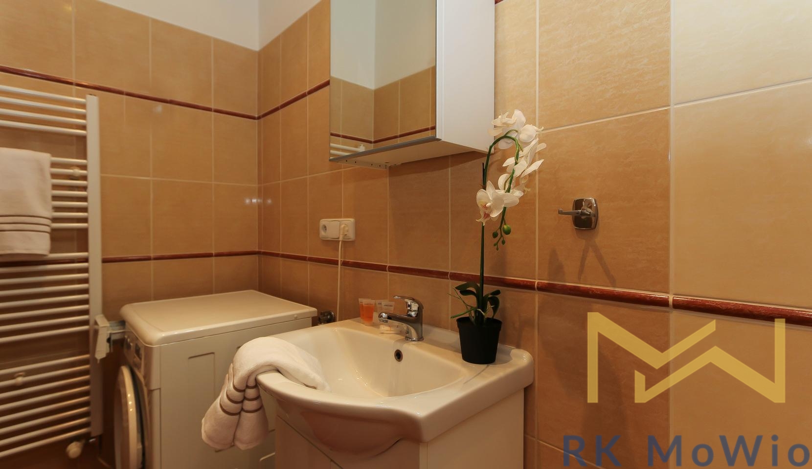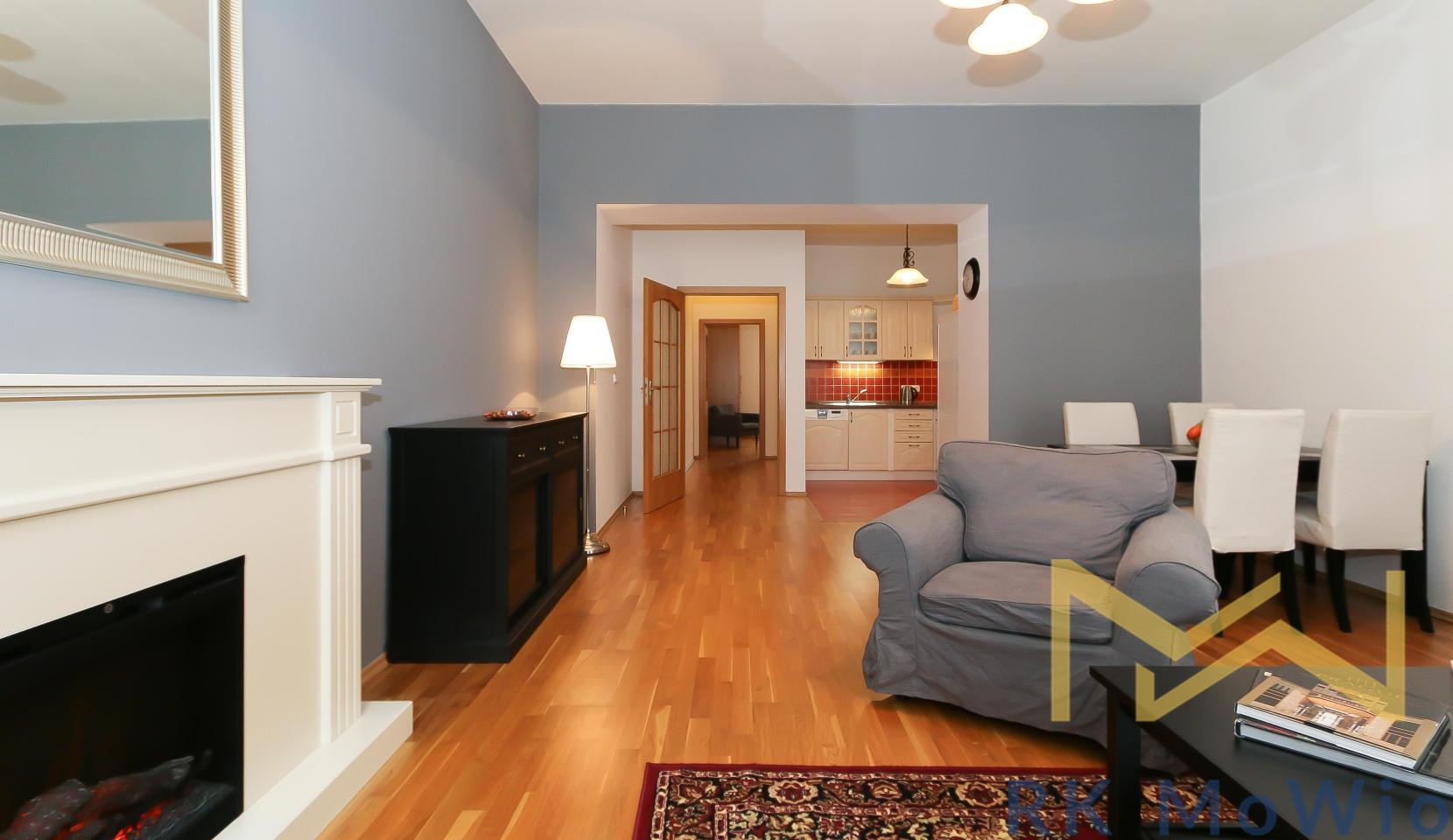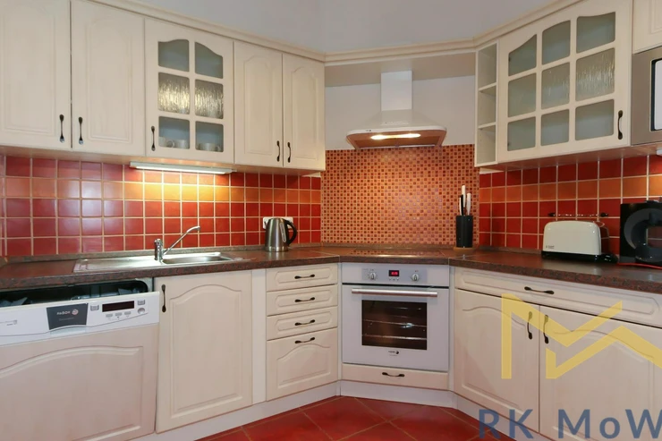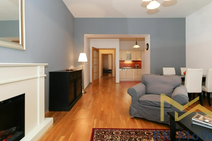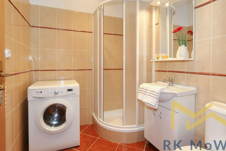 The unit features an entrance hall, a spacious living room with a fireplace, a kitchenette with dining area, a master bedroom, a second bedroom, one bathroom (with shower and washbasin) and a separate toilet. Additional equipment includes: kitchen unit with fridge-freezer, ceramic hob, extractor hood, electric and microwave oven; built-in wardrobes, washing machine, high-speed internet preparation, wooden floors and tiles. Parking space available for an extra fee.