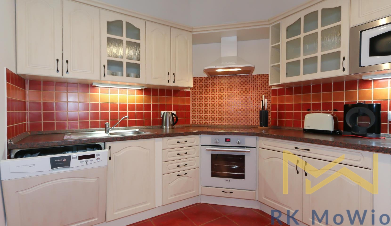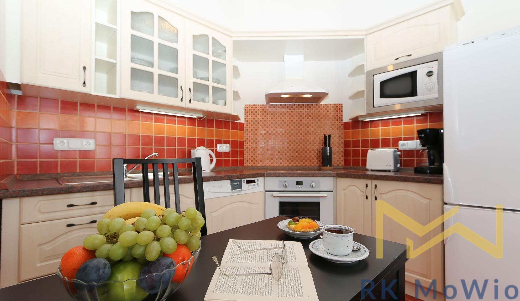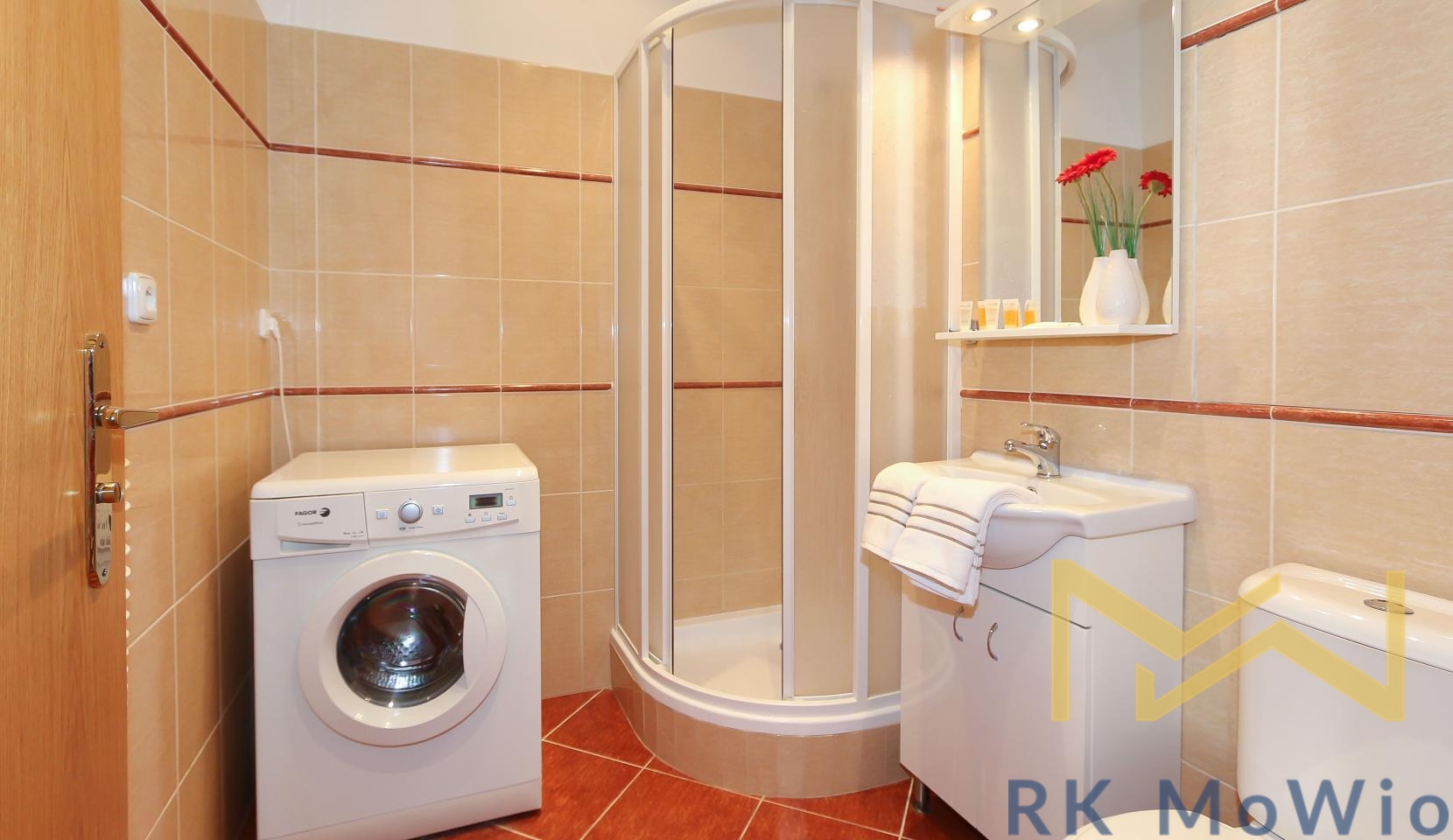 The unit features an entrance hall, a spacious living room with a fireplace, a kitchenette with dining area, a master bedroom, a second bedroom, one bathroom (with shower and washbasin) and a separate toilet. Additional equipment includes: kitchen unit with fridge-freezer, ceramic hob, extractor hood, electric and microwave oven; built-in wardrobes, washing machine, high-speed internet preparation, wooden floors and tiles. Parking space available for an extra fee.