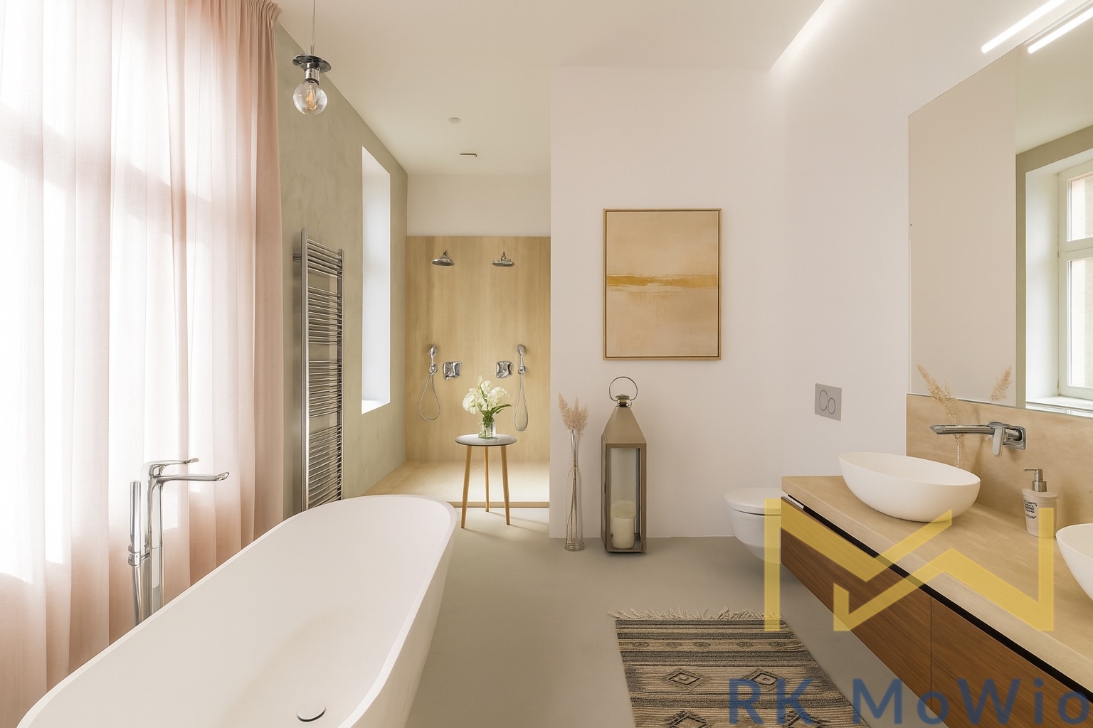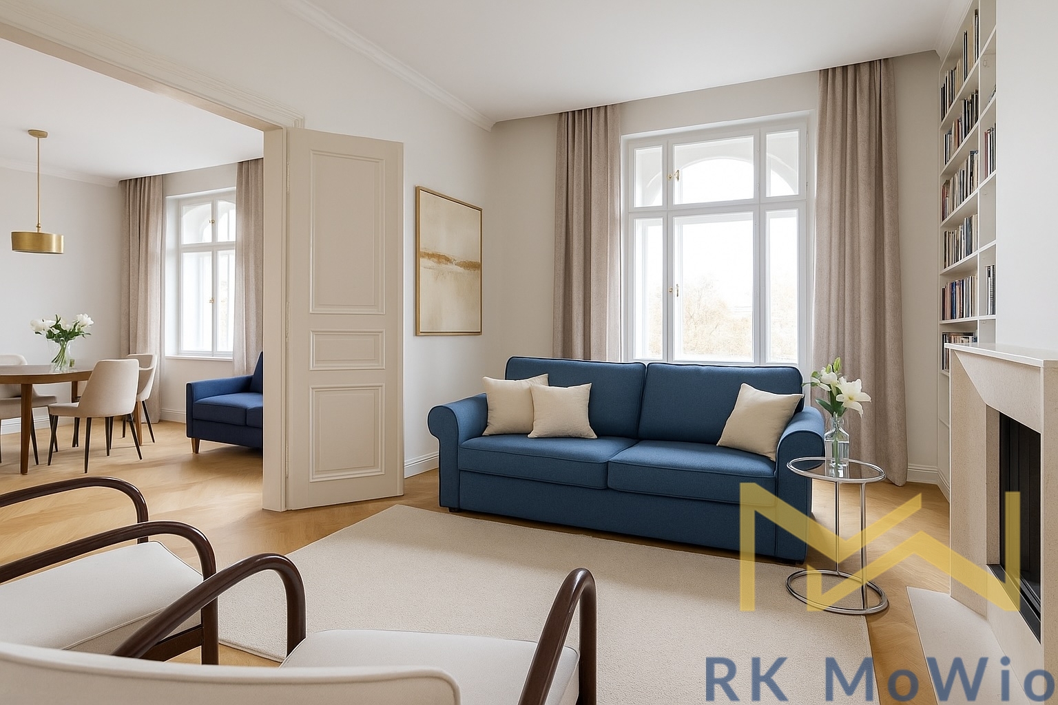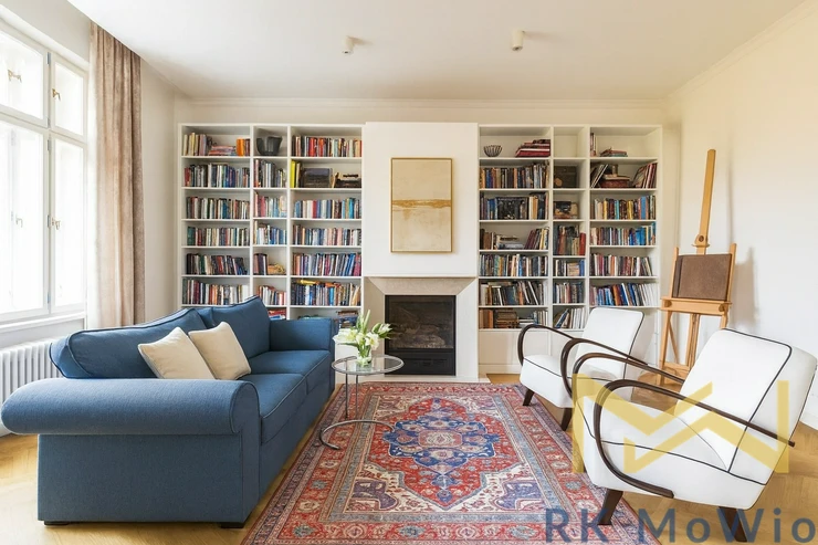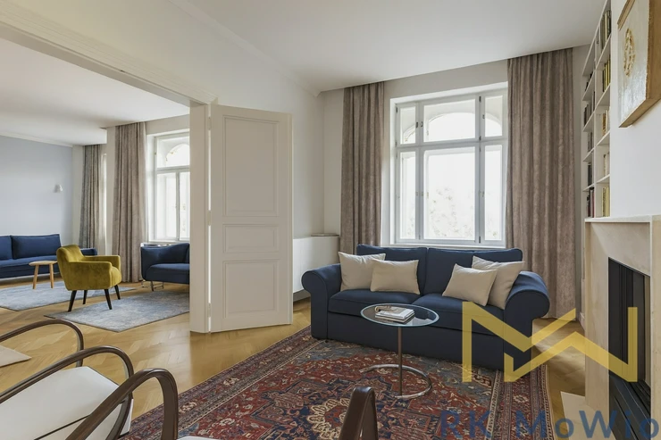 The apartment unit features an entrance hall, a spacious living room with a kitchenette and a bar counter, a master bedroom with a French window and en-suite bathroom (with bathtub, toilet, two sinks and toilet), a study with a fireplace, an additional bathroom (with shower, sink and toilet), a dressing room and a storage room. Additional apartment amenities include a kitchen with a gas stove and electric oven; a connection for a washing machine and dryer, preparation for high-speed internet,oak floors, tiles and marble tiles in the bathrooms. Possibility to rent parking spaces behind a barrier (approx. 100 m from the building) for an additional monthly fee of CZK 2,500/space + VAT. Available from 1 October 2025.